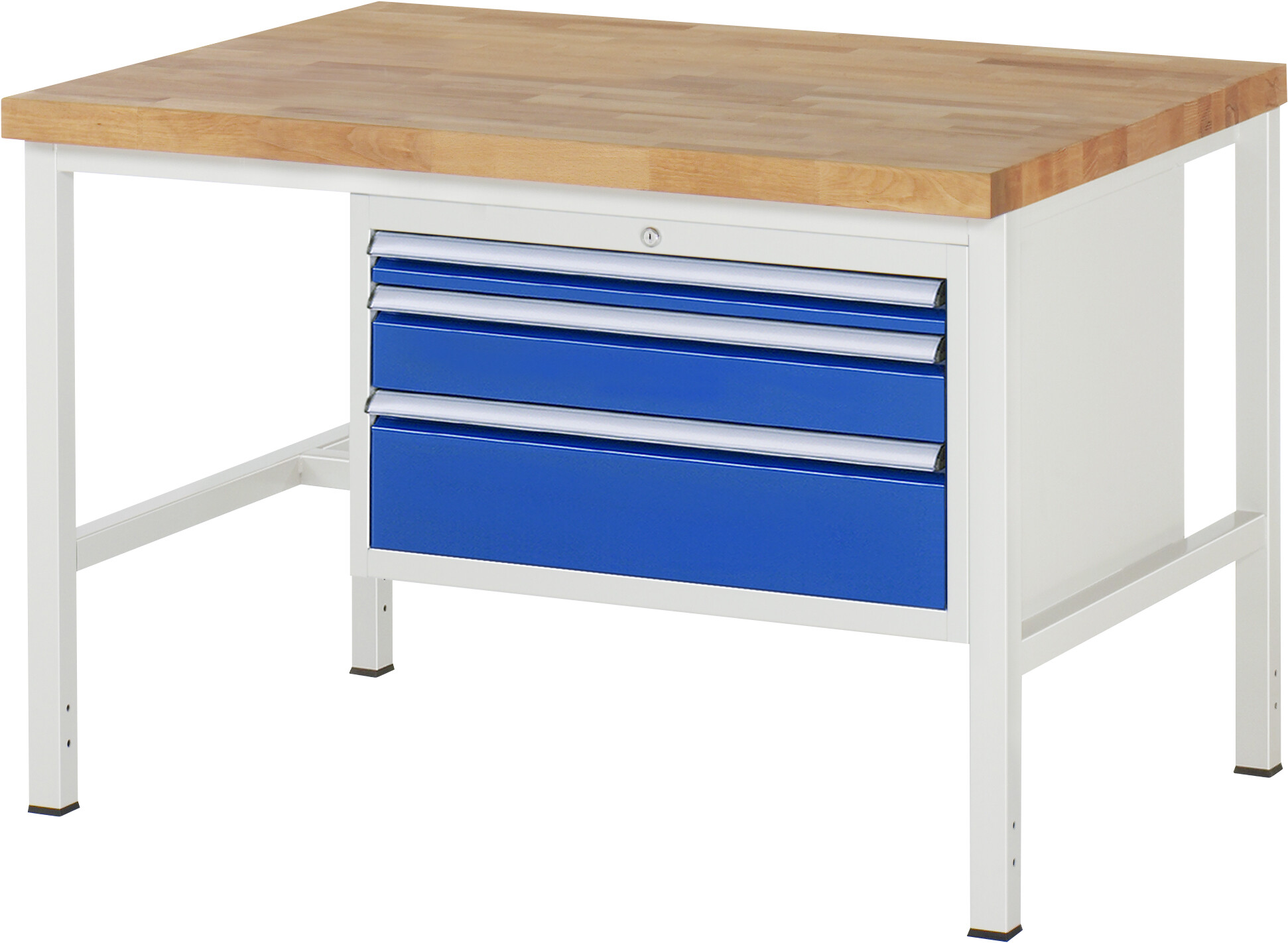 Werkbank Serie 8000 - Modell 8226 B1250 x T900 x H840 mm Buche-Massiv-Arbeitsplatte 40 mm. Gestell Vierkantrohr. 3 x Schublade (1xH60, 1xH120, 1xH180 mm). Pulverbeschichtung Flächenlast max. 1.250 kg Lieferung komplett montiert Qualitätsgarantie 5 Jahre Made in Germany