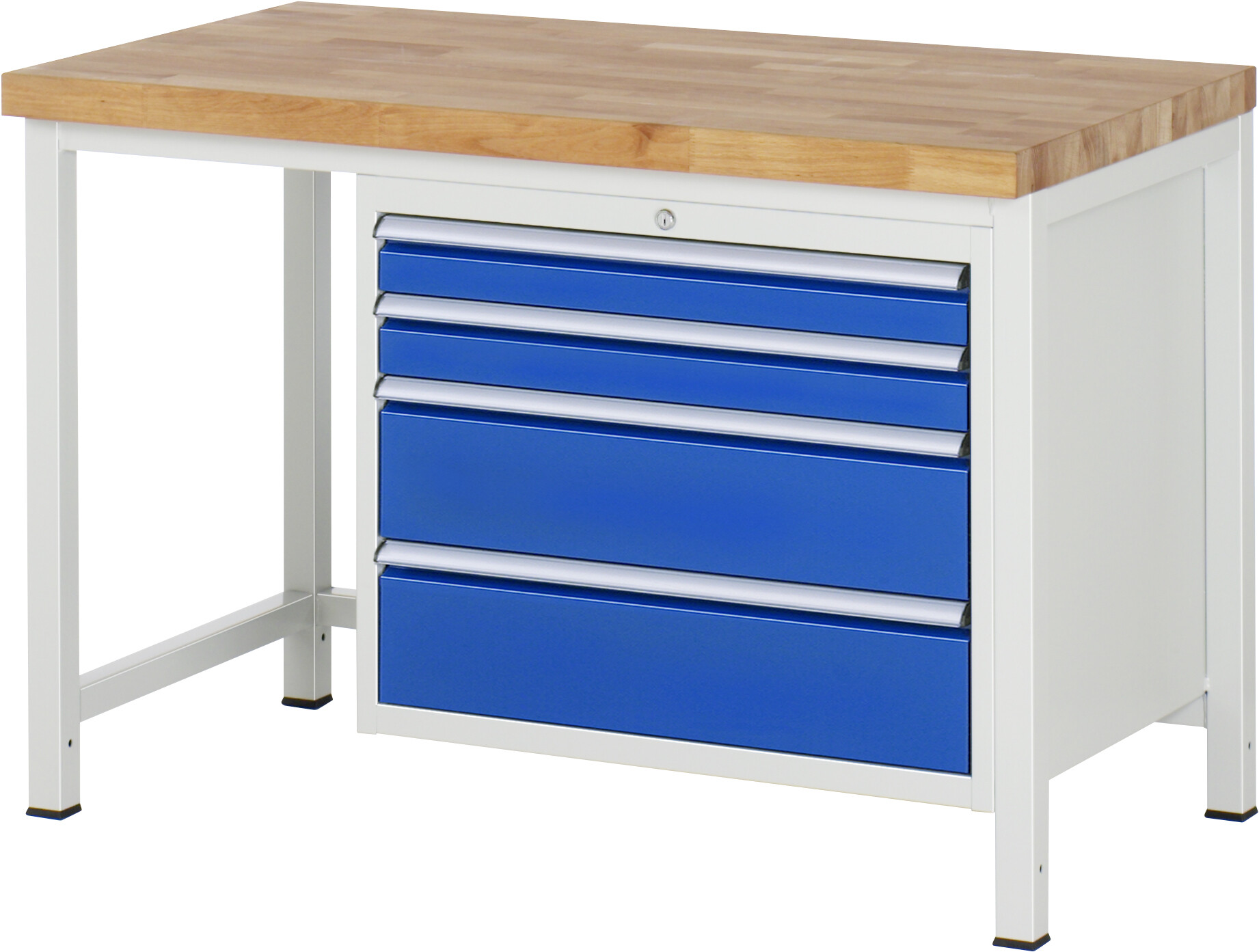 Werkbank Serie 8000 - Modell 8261 B1250 x T700 x H840 mm Buche-Massiv-Arbeitsplatte 40 mm. Gestell Vierkantrohr. 4 x Schublade (2xH90, 2xH180 mm). Pulverbeschichtung Flächenlast max. 1.250 kg Lieferung komplett montiert Qualitätsgarantie 5 Jahre Made in Germany