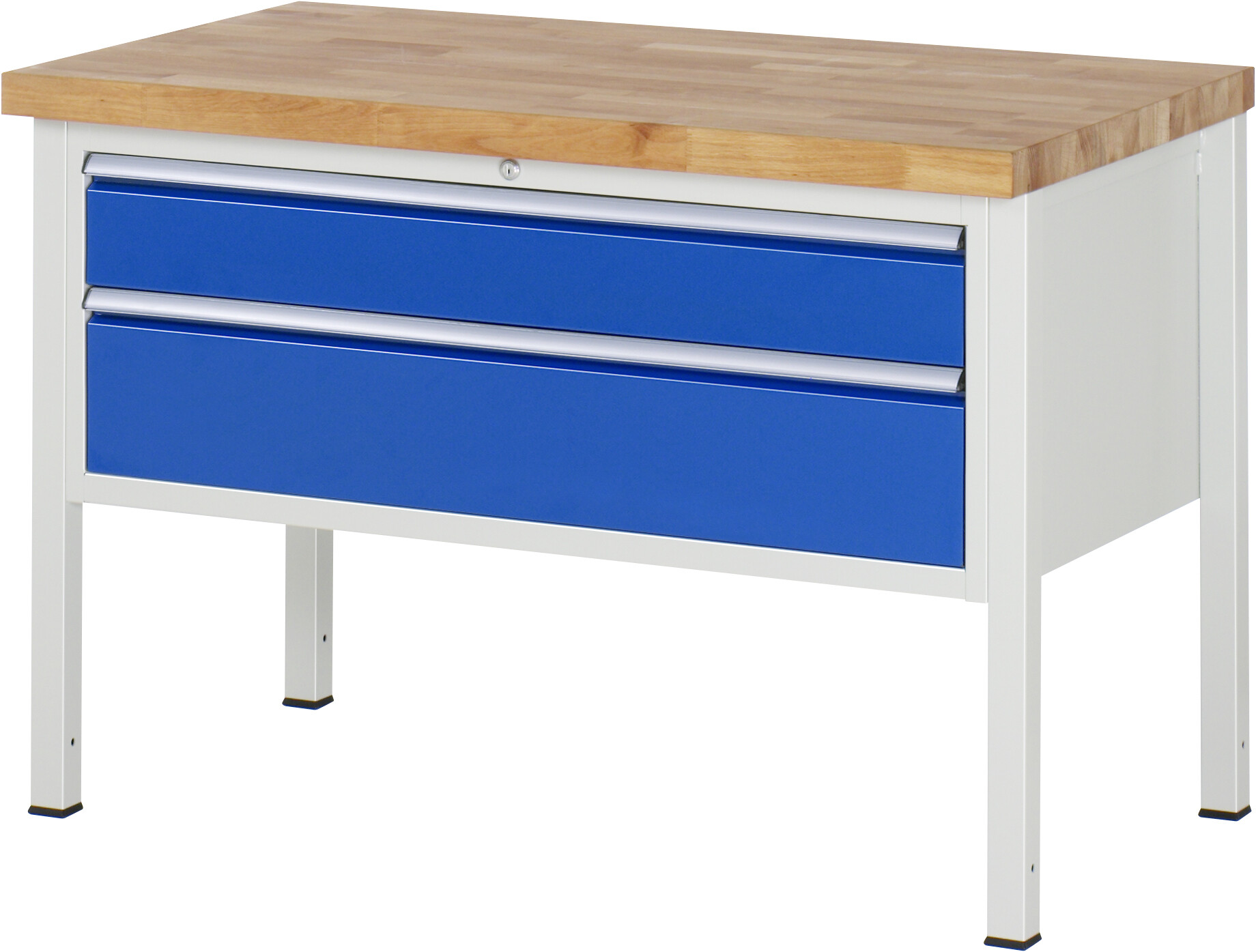 Werkbank Serie 8000 - Modell 8323 B1250 x T700 x H840 mm Buche-Massiv-Arbeitsplatte 40 mm. Gestell Vierkantrohr. 2 x Schublade (1xH150, 1xH210 mm). Pulverbeschichtung Flächenlast max. 1.250 kg Lieferung komplett montiert Qualitätsgarantie 5 Jahre Made in Germany