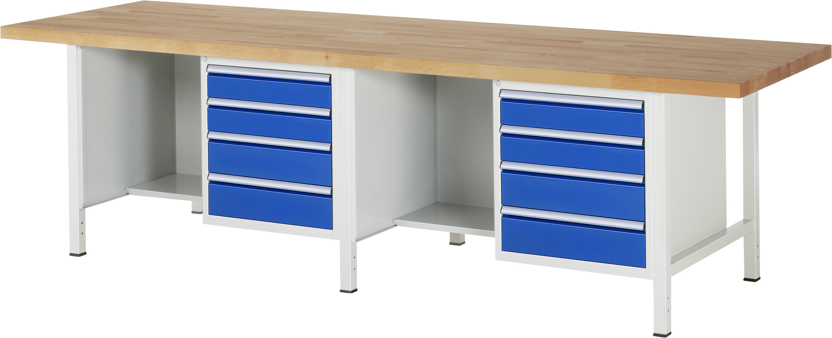 Werkbank Serie 8000 - Modell 8453 B3000 x T900 x H840 mm Buche-Massiv-Arbeitsplatte 40 mm. Gestell Vierkantrohr. 8 x Schublade (4xH120, 4x150 mm). Pulverbeschichtung Flächenlast max. 1.250 kg Lieferung komplett montiert Qualitätsgarantie 5 Jahre Made in Germany