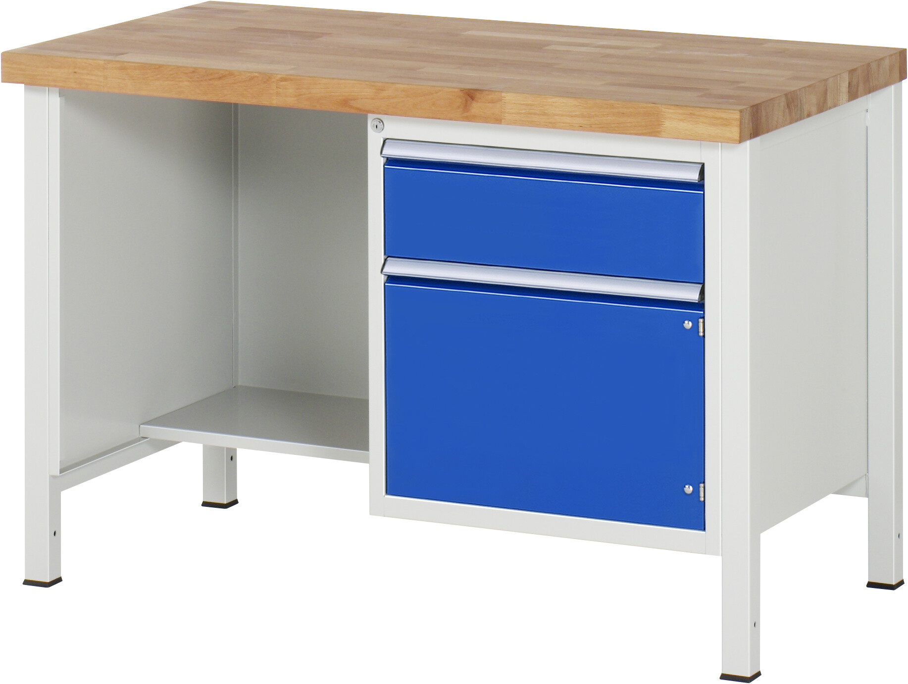 Werkbank Serie 8000 - Modell 8455 B1250 x T900 x H840 mm Buche-Massiv-Arbeitsplatte 40 mm. Gestell Vierkantrohr. 1 x Schublade (1xH180 mm). 1 x Flügeltür (H360 mm). Pulverbeschichtung Flächenlast max. 1.250 kg Lieferung komplett montiert Qualitätsgarantie 5 Jahre Made in Germany