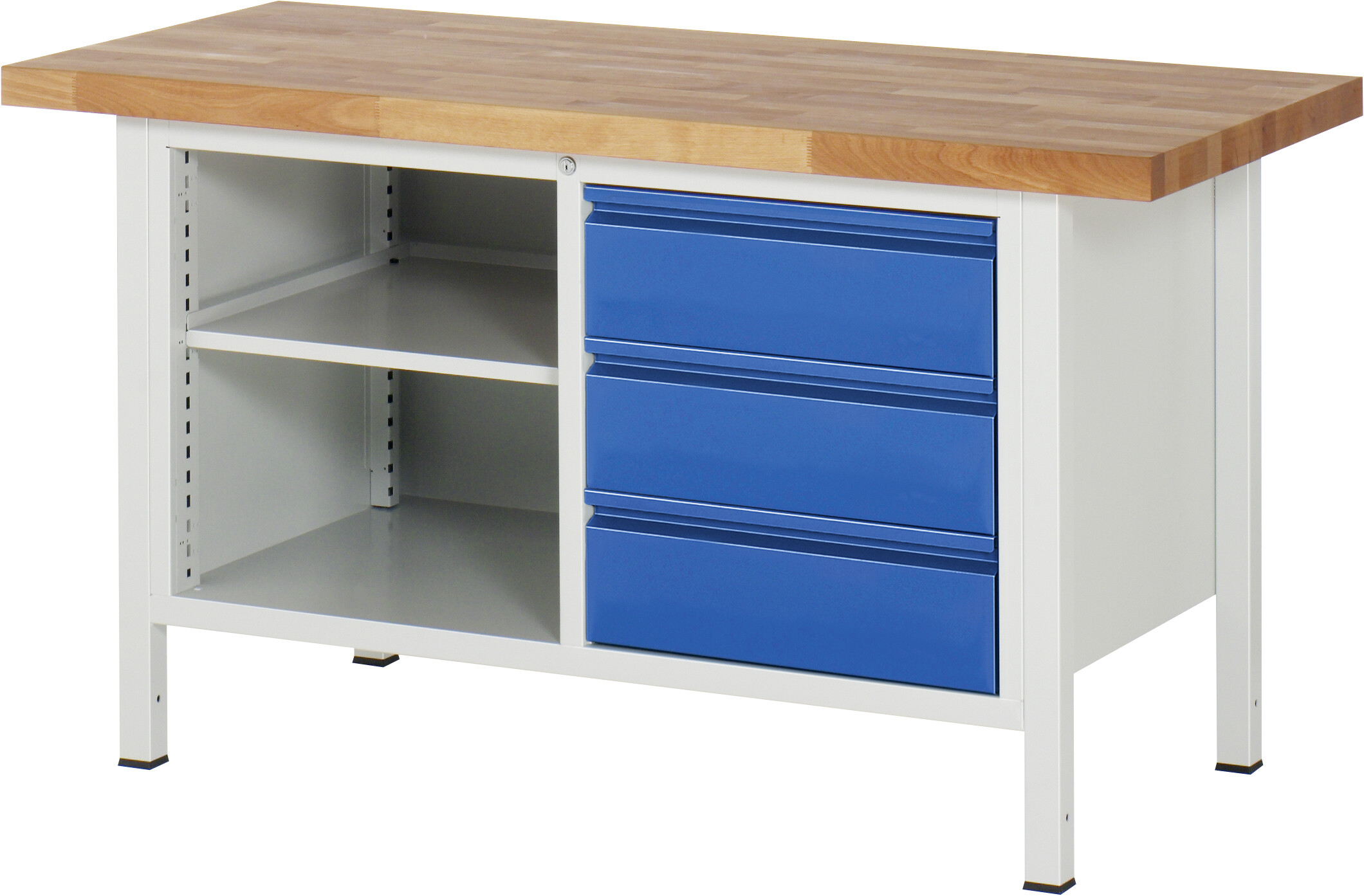 Werkbank Serie 8000 - Modell 8462 BASIC B1500 x T700 x H840-1040 mm Buche-Massiv-Arbeitsplatte 40 mm. Gestell Vierkantrohr. Werkbank mit einstellbarer Arbeitshöhe. 3 x Schublade auf rollengelagerten Auszugsschienen (3xH180 mm). Offenes Fach mit höhenverstellbarem Fachboden. Pulverbeschichtung Flächenlast max. 1.250 kg Lieferung komplett montiert Qualitätsgarantie 5 Jahre Made in Germany