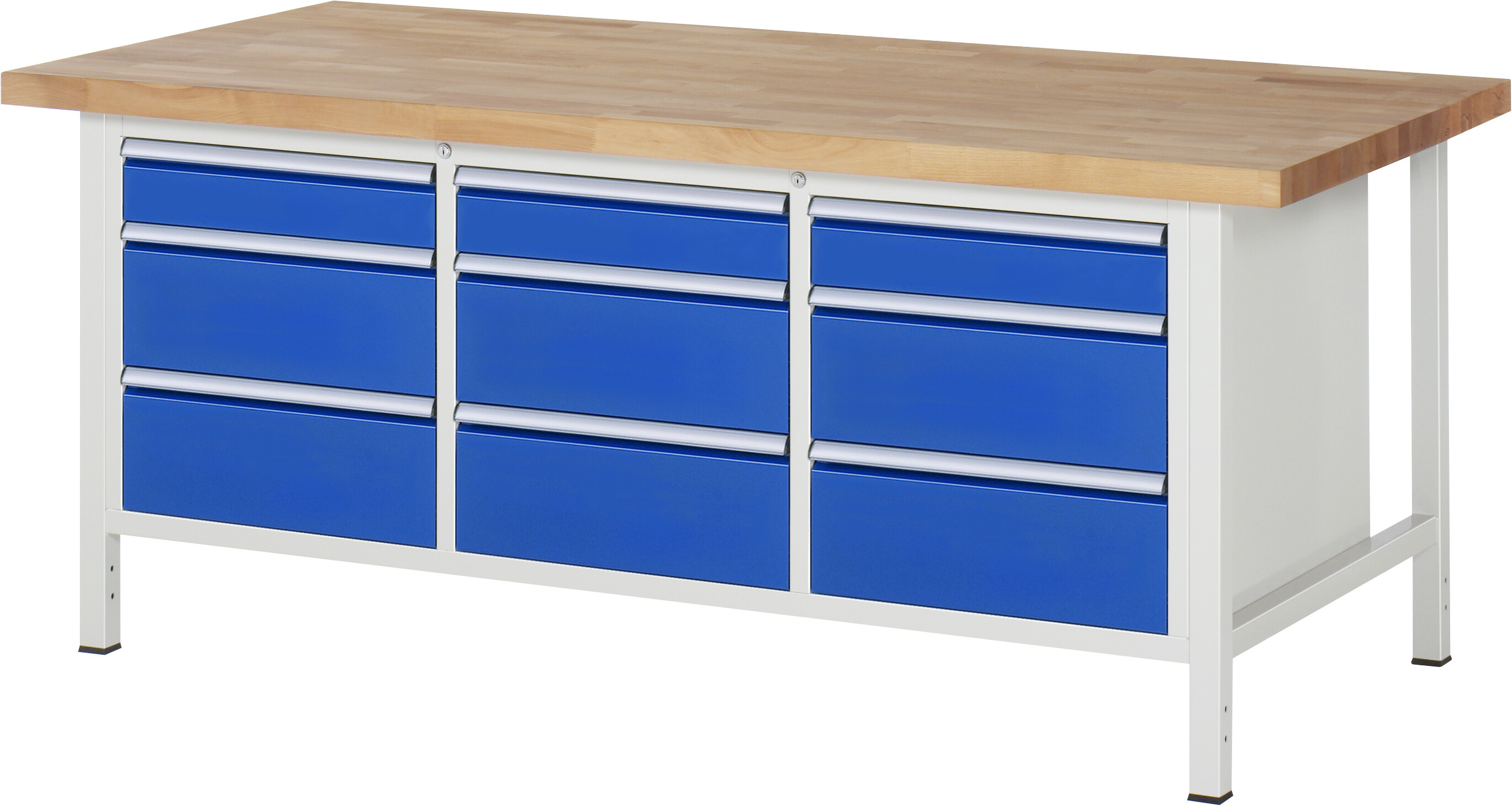 Werkbank Serie 8000 - Modell 8573 B2000 x T900 x H840 mm Buche-Massiv-Arbeitsplatte 40 mm. Gestell Vierkantrohr. 9 x Schublade (3xH120, 6xH120 mm). Pulverbeschichtung Flächenlast max. 1.250 kg Lieferung komplett montiert Qualitätsgarantie 5 Jahre Made in Germany