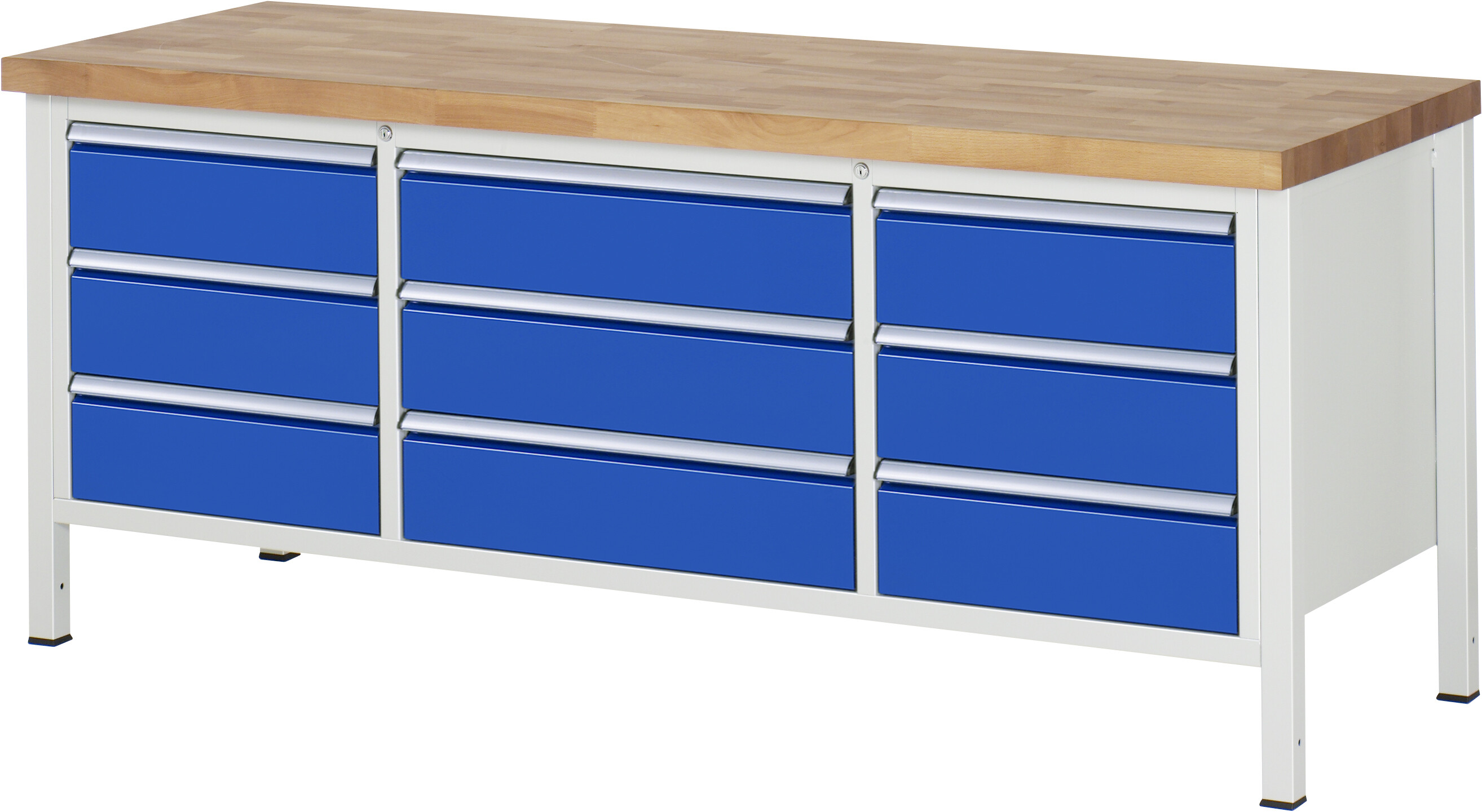 Werkbank Serie 8000 - Modell 8754 B2000 x T700 x H840 mm Buche-Massiv-Arbeitsplatte 40 mm. Gestell Vierkantrohr. 9 x Schublade (9xH180 mm) Pulverbeschichtung Flächenlast max. 1.250 kg Lieferung komplett montiert Qualitätsgarantie 5 Jahre Made in Germany