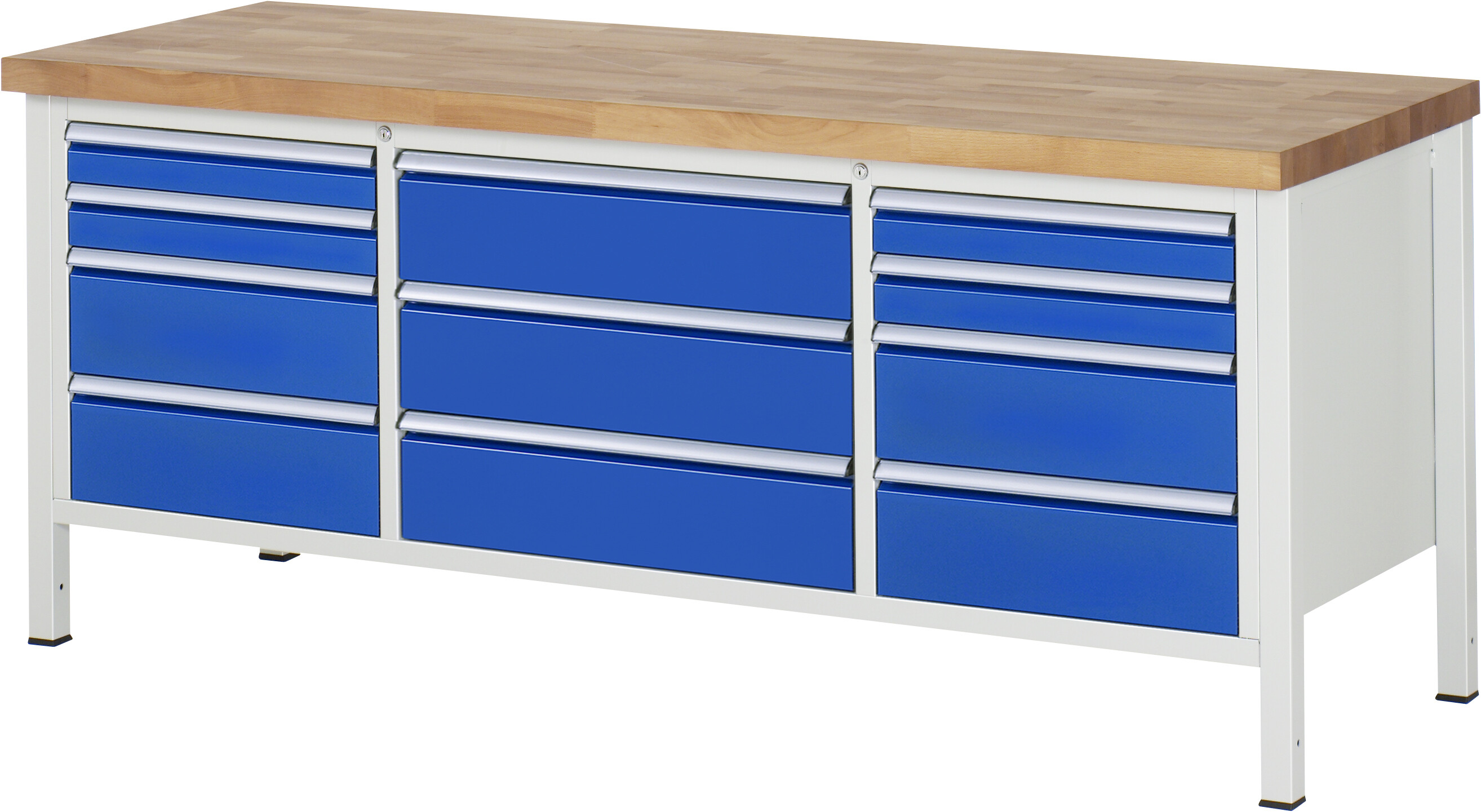 Werkbank Serie 8000 - Modell 8757 B2000 x T700 x H840 mm Buche-Massiv-Arbeitsplatte 40 mm. Gestell Vierkantrohr. 11 x Schublade (4xH90, 7xH180 mm). Pulverbeschichtung Flächenlast max. 1.250 kg Lieferung komplett montiert Qualitätsgarantie 5 Jahre Made in Germany