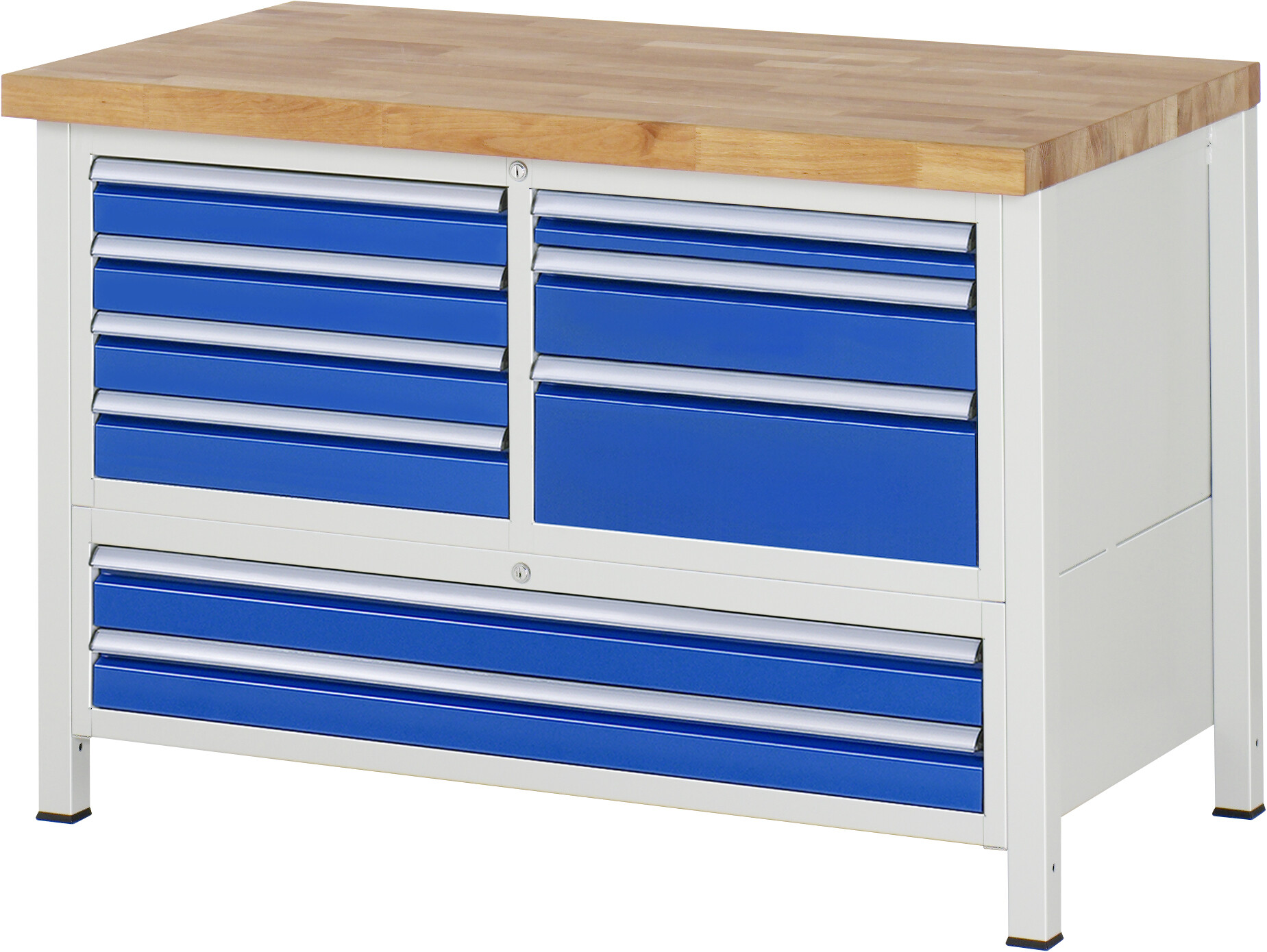 Werkbank Serie 8000 - Modell 8933 B1250 x T700 x H840 mm Buche-Massiv-Arbeitsplatte 40 mm. Gestell Vierkantrohr. 9 x Schublade (1xH60, 4xH90, 1xH120, 1xH180, 2xH90 mm). Pulverbeschichtung Flächenlast max. 1.250 kg Lieferung komplett montiert Qualitätsgarantie 5 Jahre Made in Germany
