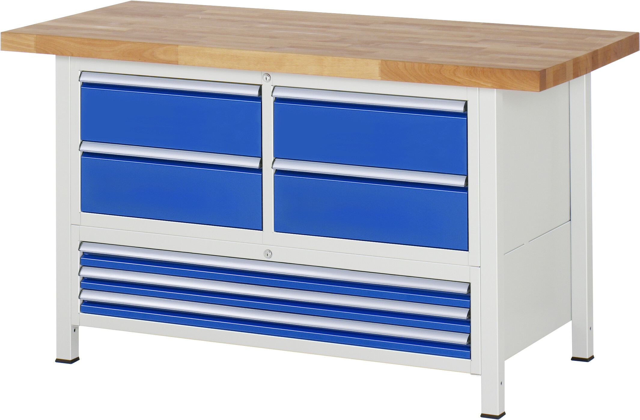 Werkbank Serie 8000 - Modell 8934 B1500 x T700 x H840 mm Buche-Massiv-Arbeitsplatte 40 mm. Gestell Vierkantrohr. 7 x Schublade (4xH180, 3xH60 mm). Pulverbeschichtung Flächenlast max. 1.250 kg Lieferung komplett montiert Qualitätsgarantie 5 Jahre Made in Germany