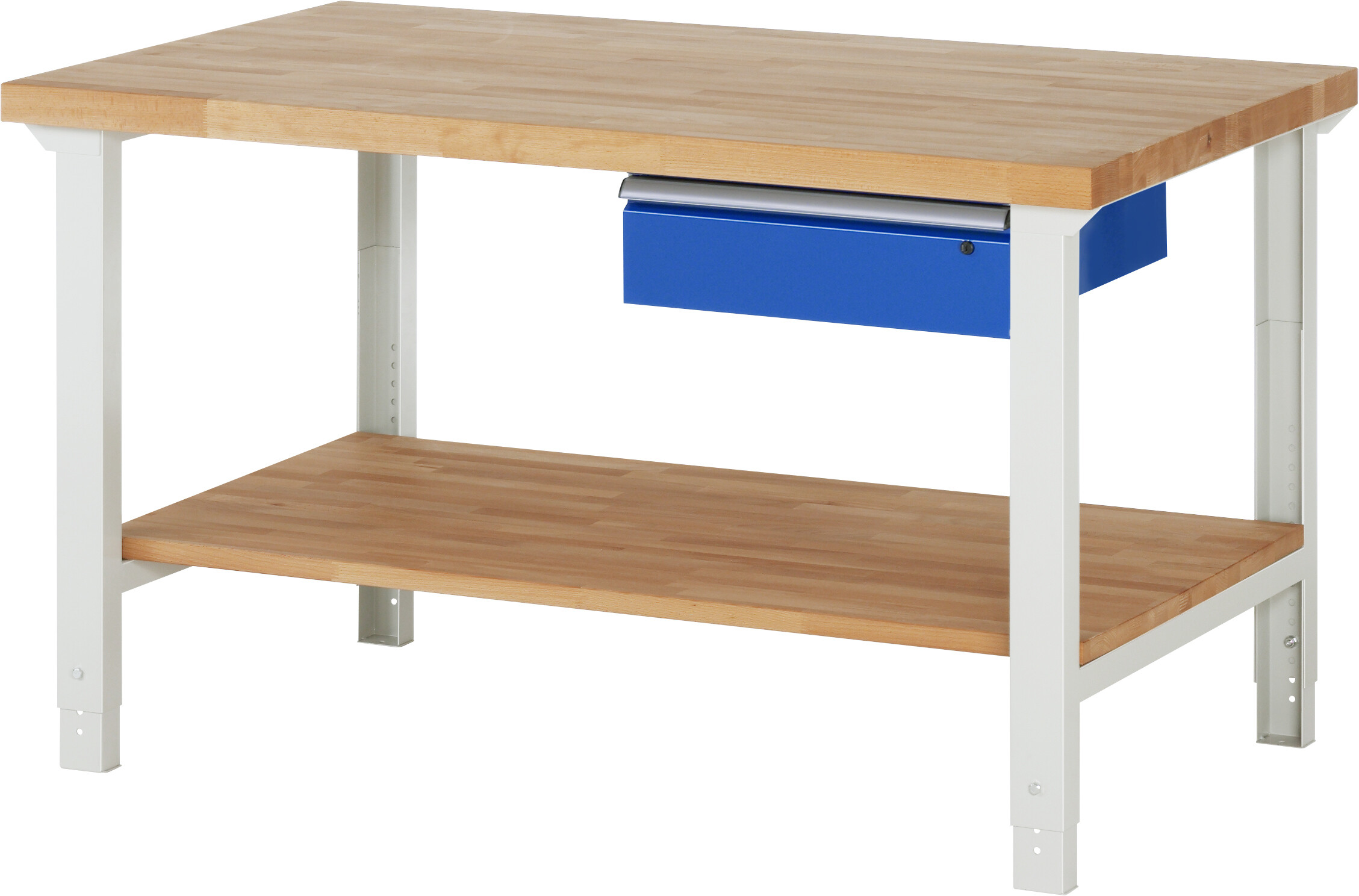 Werkbank Serie 7000 - Modell 7001 B1500 x T900 x H790-1140 mm Buche-Massiv-Platte 40 mm. Werkbank mit Buche-Massiv-Ablageboden (T 745 mm) und einstellbarer Arbeitshöhe. 1 x Schublade (1xH150 mm). Pulverbeschichtung Flächenlast max. 750 kg Lieferung komplett montiert Qualitätsgarantie 5 Jahre Made in Germany