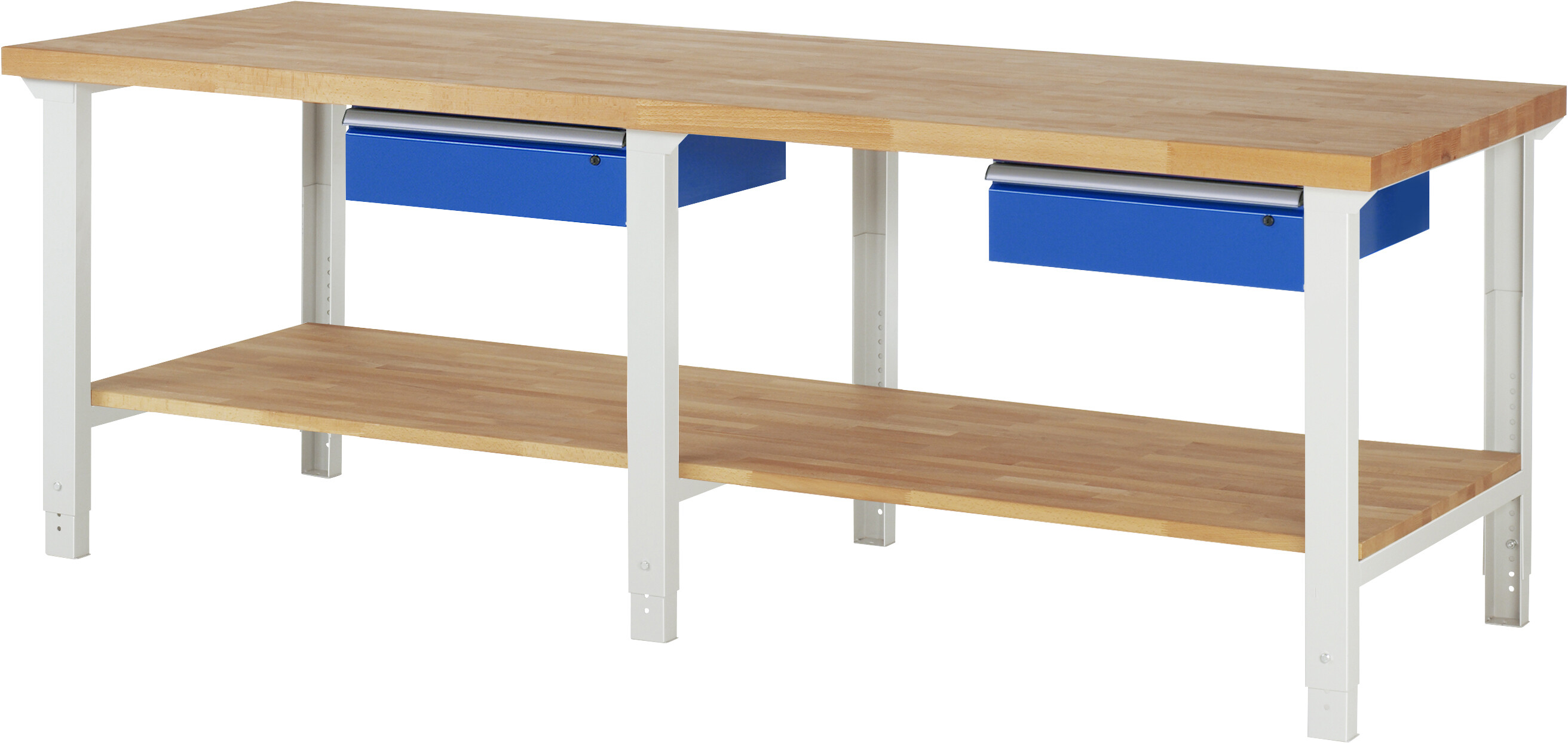 Werkbank Serie 7000 - Modell 7001 B2500 x T900 x H790-1140 mm Buche-Massiv-Platte 40 mm. Werkbank mit Buche-Massiv-Ablageboden (T 745 mm) und einstellbarer Arbeitshöhe. 1 x Schublade (1xH150 mm). Pulverbeschichtung Flächenlast max. 750 kg Lieferung komplett montiert Qualitätsgarantie 5 Jahre Made in Germany