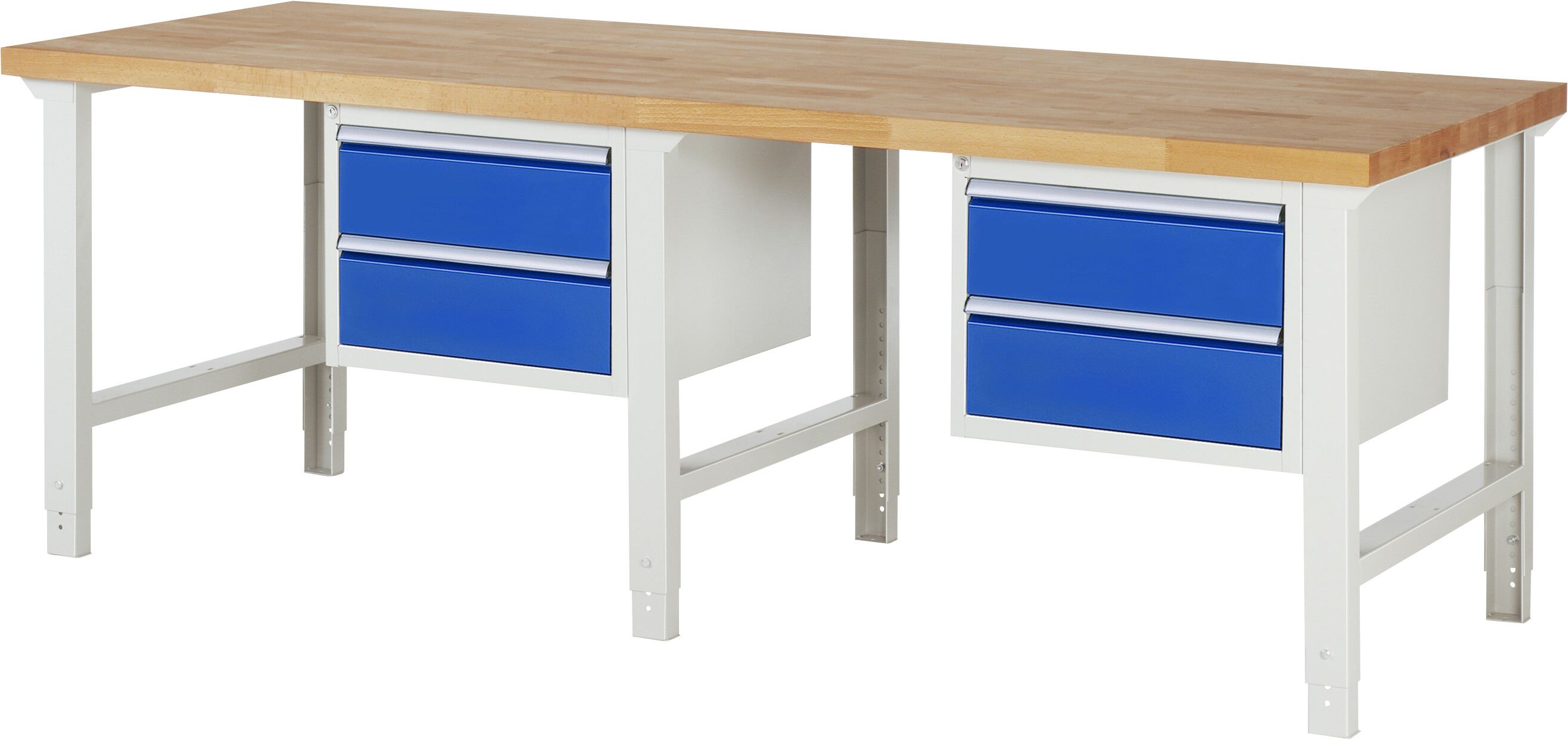 Werkbank Serie 7000 - Modell 7125 B2500 x T900 x H790-1140 mm Buche-Massiv-Platte 40 mm. 2 x Schublade (2xH180 mm). Pulverbeschichtung Flächenlast max. 750 kg Lieferung komplett montiert Qualitätsgarantie 5 Jahre Made in Germany
