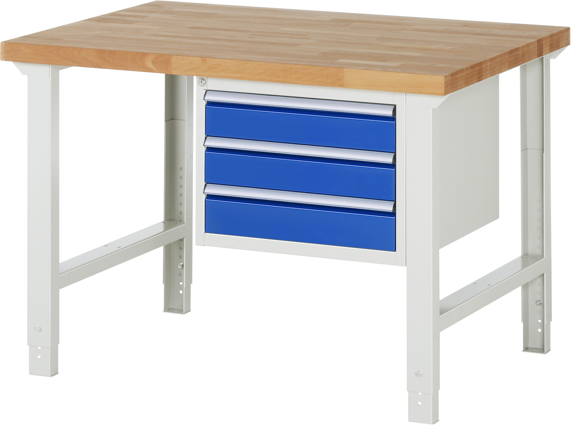 Werkbank Serie 7000 - Modell 7127 B1250 x T900 x H790-1140 mm Buche-Massiv-Platte 40 mm. 3 x Schublade (1xH120 mm). Pulverbeschichtung Flächenlast max. 750 kg Lieferung komplett montiert Qualitätsgarantie 5 Jahre Made in Germany