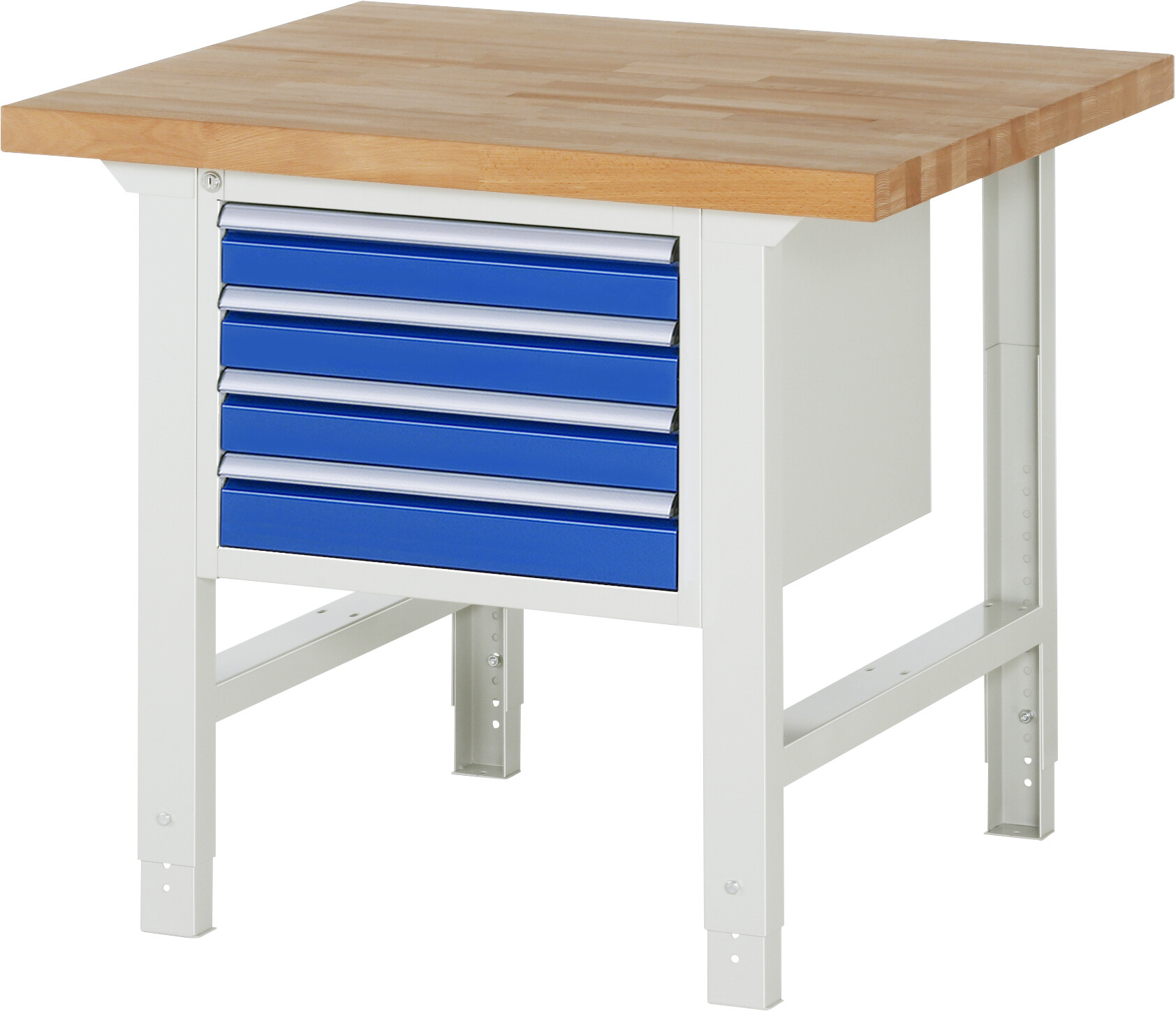 Werkbank Serie 7000 - Modell 7133 B1000 x T900 x H790-1140 mm Buche-Massiv-Platte 40 mm. 4 x Schublade (4xH90 mm). Pulverbeschichtung Flächenlast max. 750 kg Lieferung komplett montiert Qualitätsgarantie 5 Jahre Made in Germany