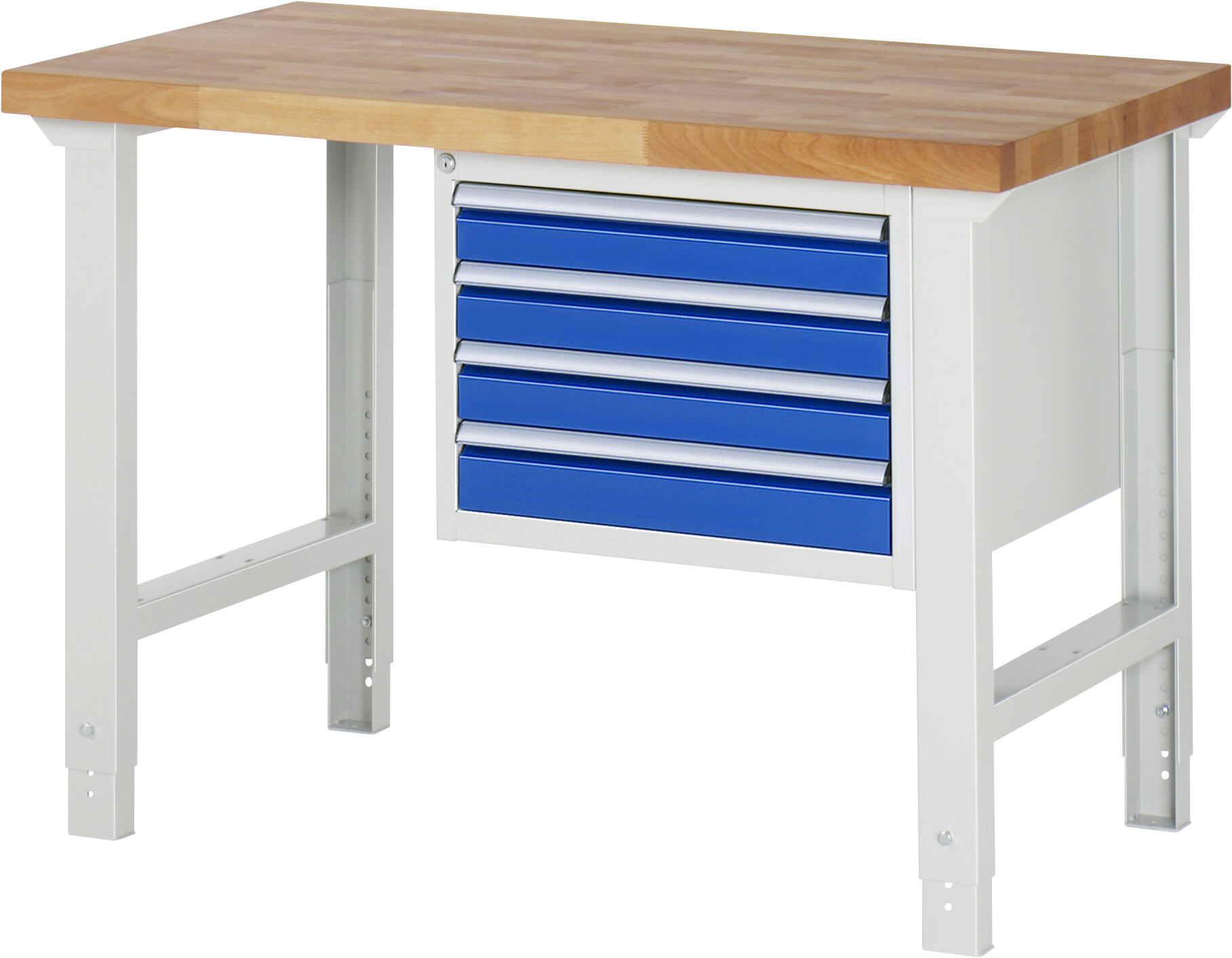 Werkbank Serie 7000 - Modell 7133 B1250 x T700 x H790-1140 mm Buche-Massiv-Platte 40 mm. 4 x Schublade (4xH90 mm). Pulverbeschichtung Flächenlast max. 750 kg Lieferung komplett montiert Qualitätsgarantie 5 Jahre Made in Germany