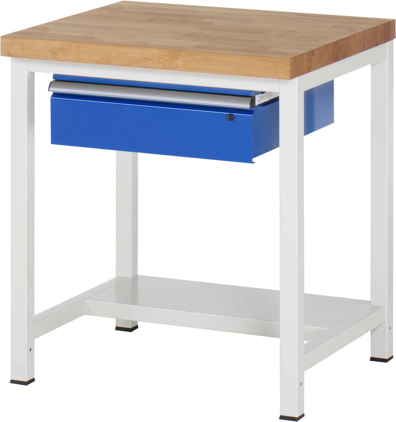 Werkbank Serie 8000 - Modell 8001 B750 x T700 x H840-1040 mm Buche-Massiv-Arbeitsplatte 40 mm. Gestell Vierkantrohr. Werkbank mit einstellbarer Arbeitshöhe und Stahlblech-Ablageboden (T 320 mm). 1 x Schublade auf rollengelagerten Auszugsschienen (1xH150 mm) Pulverbeschichtung Flächenlast max. 1.250 kg Lieferung komplett montiert Qualitätsgarantie 5 Jahre Made in Germany