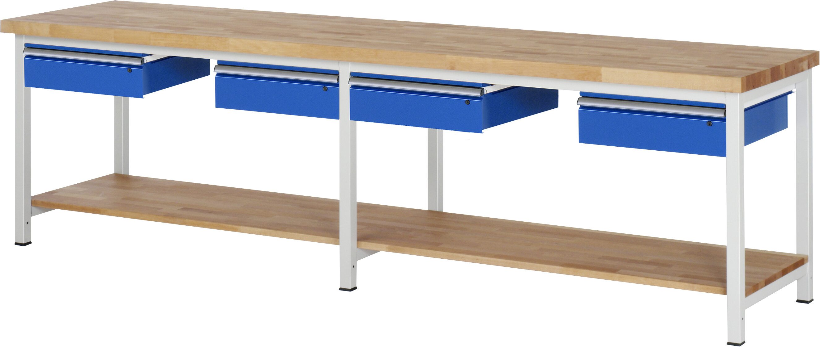 Werkbank Serie 8000 - Modell 8002 B3000 x T700 x H840-1040 mm Buche-Massiv-Arbeitsplatte 40 mm. Gestell Vierkantrohr. Werkbank mit Buche-Massiv-Ablageboden (T 545 mm). 4 x Schublade auf rollengelagerten Auszugsschienen (4xH150 mm). Pulverbeschichtung Flächenlast max. 1.250 kg Lieferung komplett montiert Qualitätsgarantie 5 Jahre Made in Germany