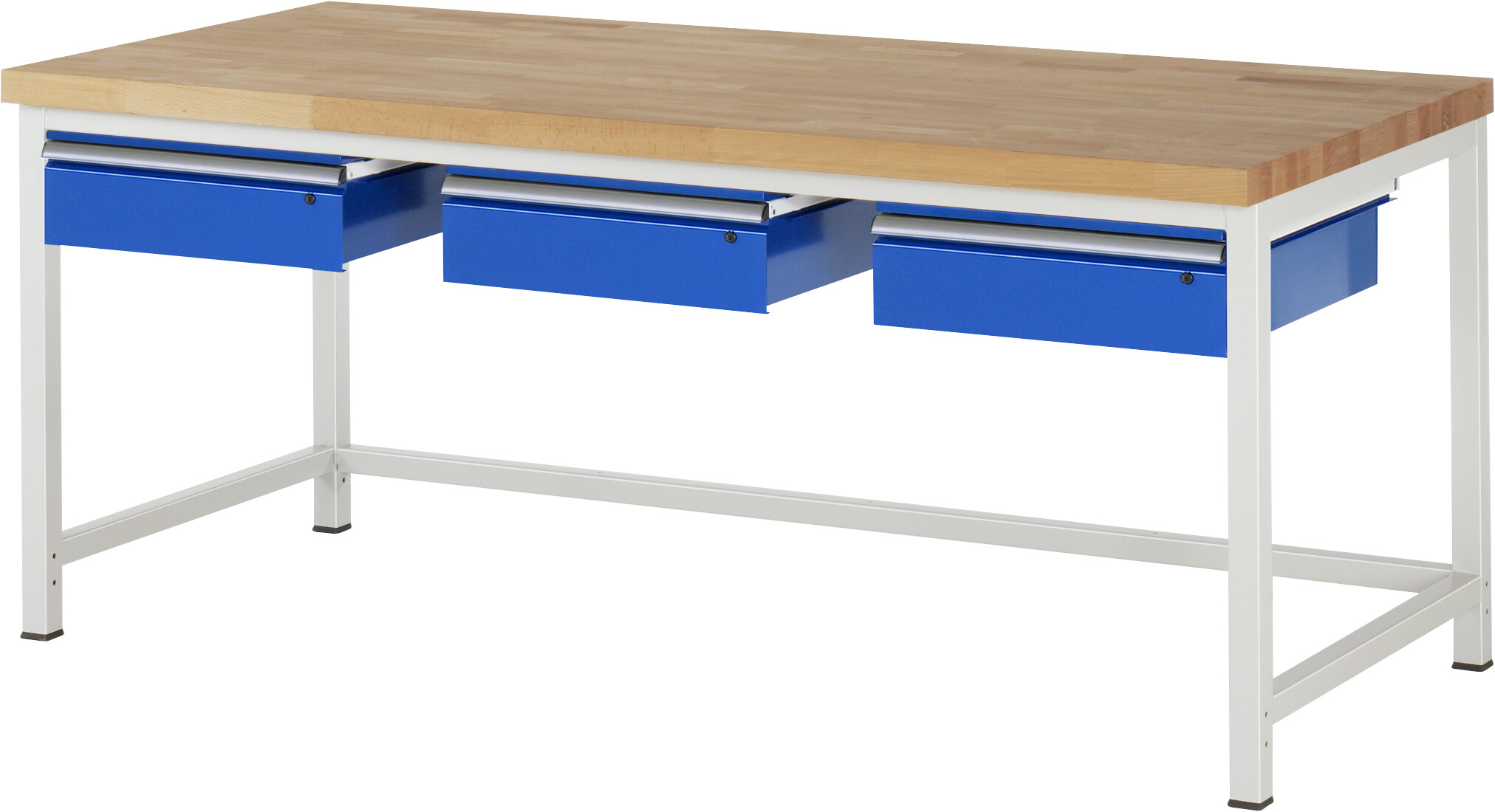 Werkbank Serie 8000 - Modell 8003 B2000 x T900 x H840-1040 mm Buche-Massiv-Arbeitsplatte 40 mm. Gestell Vierkantrohr. Werkbank mit einstellbarer Arbeitshöhe. 3 x Schublade auf rollengelagerten Auszugsschienen (3xH150 mm). Pulverbeschichtung Flächenlast max. 1.250 kg Lieferung komplett montiert Qualitätsgarantie 5 Jahre Made in Germany