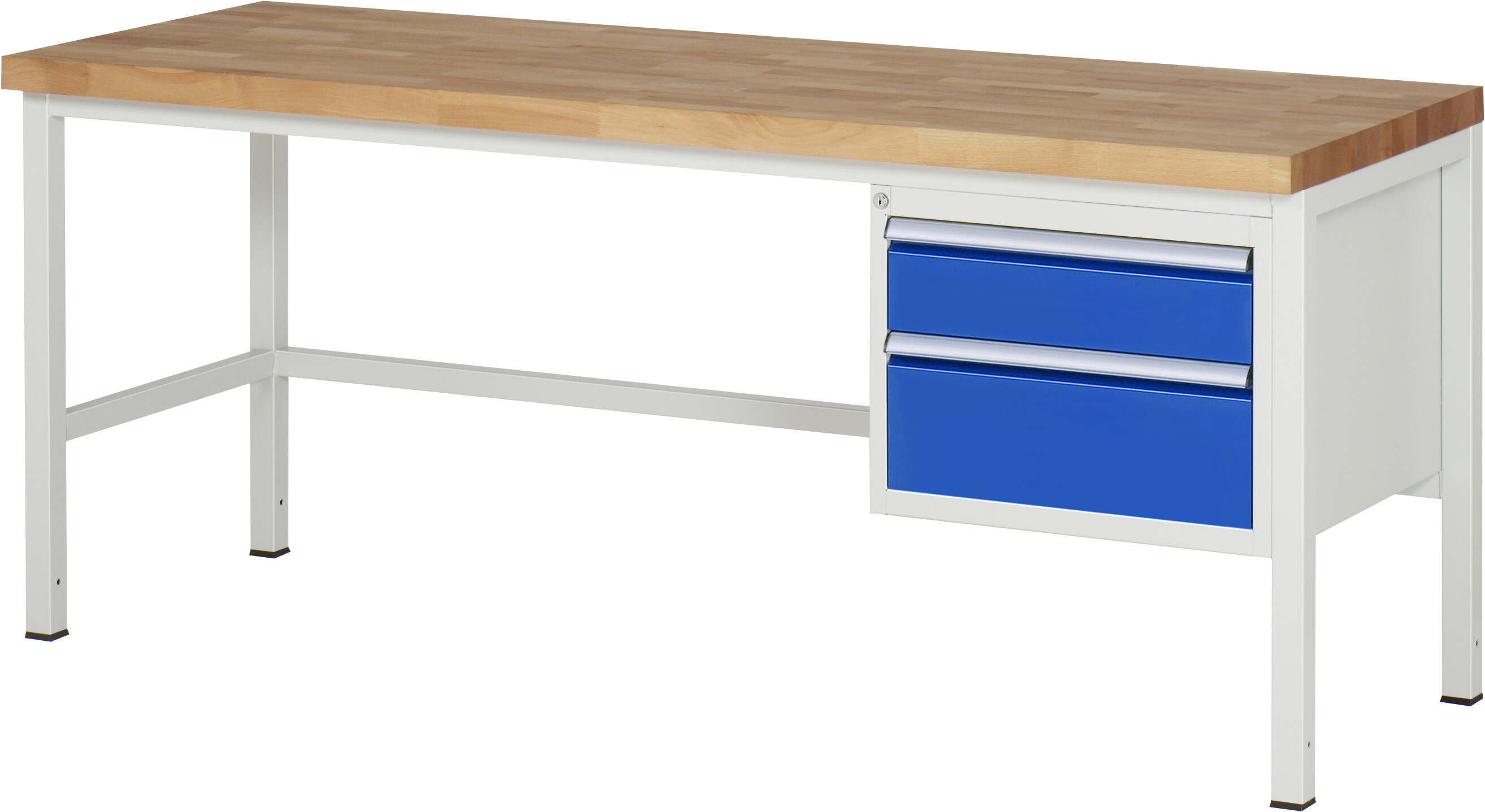 Werkbank Serie 8000 - Modell 8123 B2000 x T700 x H840-1040 mm Buche-Massiv-Arbeitsplatte 40 mm. Gestell Vierkantrohr. Werkbank mit einstellbarer Arbeitshöhe. 2 x Schublade (1xH150, 1x210 mm). Pulverbeschichtung Flächenlast max. 1.250 kg Lieferung komplett montiert Qualitätsgarantie 5 Jahre Made in Germany