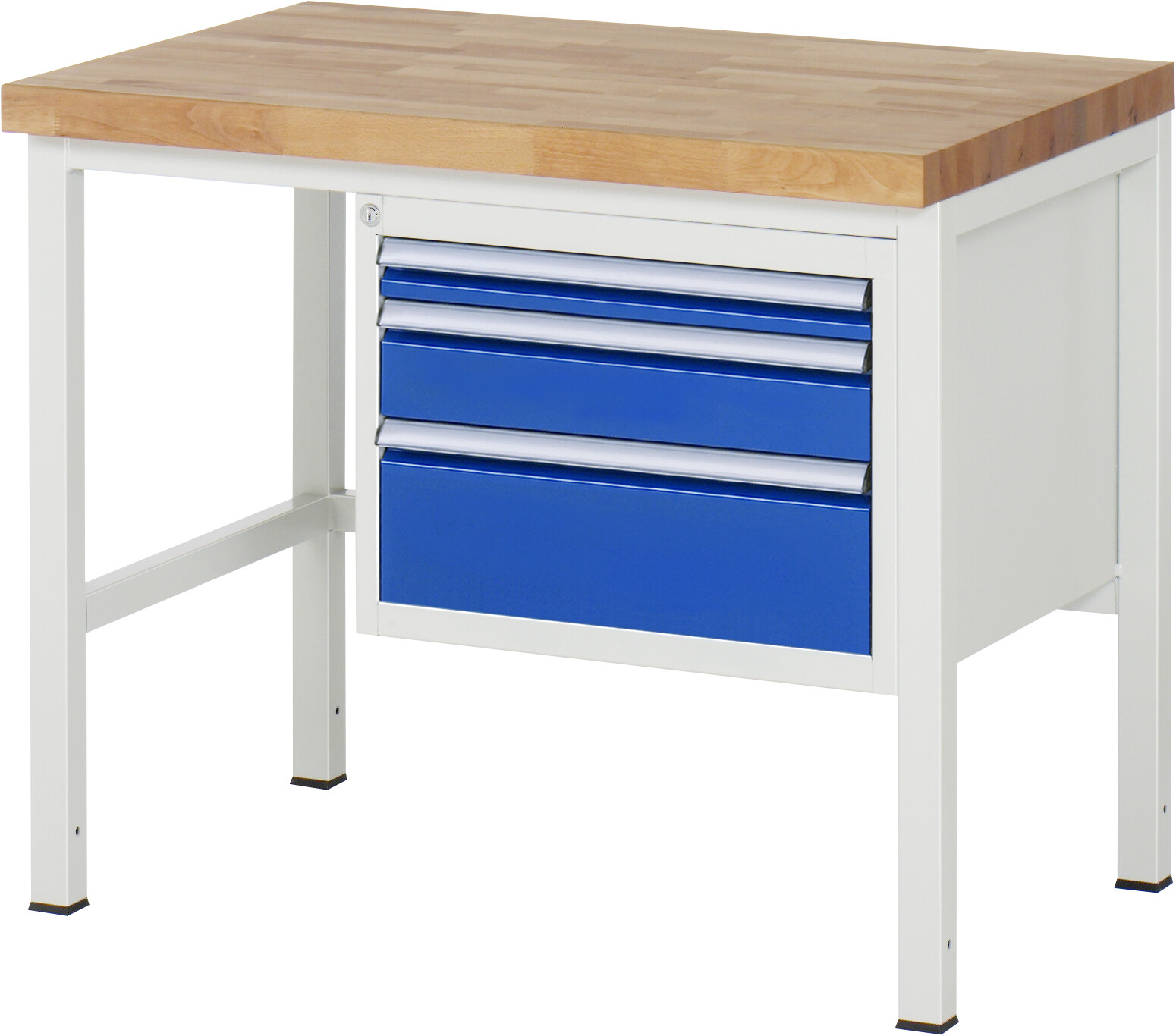 Werkbank Serie 8000 - Modell 8126 B1000 x T700 x H840-1040 mm Buche-Massiv-Arbeitsplatte 40 mm. Gestell Vierkantrohr. Werkbank mit einstellbarer Arbeitshöhe. 3 x Schublade (1xH60, 1x120, 1x180 mm). Pulverbeschichtung Flächenlast max. 1.250 kg Lieferung komplett montiert Qualitätsgarantie 5 Jahre Made in Germany