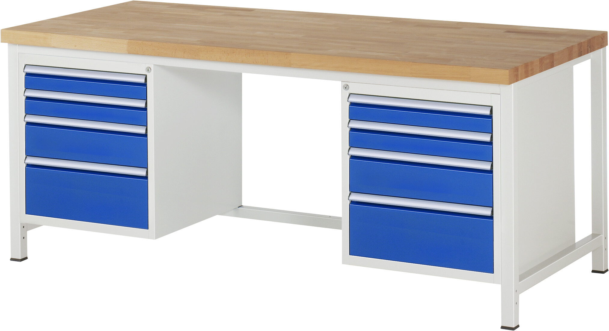 Werkbank Serie 8000 - Modell 8182 B2000 x T900 x H840-1040 mm Buche-Massiv-Arbeitsplatte 40 mm. Gestell Vierkantrohr. Werkbank mit einstellbarer Arbeitshöhe. 8 x Schublade (4xH90, 2xH150, 2xH210 mm). Pulverbeschichtung Flächenlast max. 1.250 kg Lieferung komplett montiert Qualitätsgarantie 5 Jahre Made in Germany