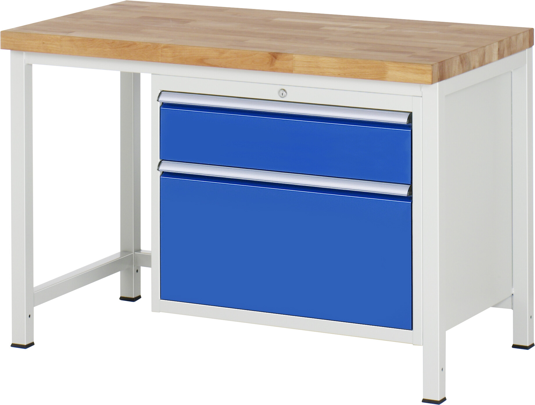 Werkbank Serie 8000 - Modell 8256 B1250 x T700 x H840-1040 mm Buche-Massiv-Arbeitsplatte 40 mm. Gestell Vierkantrohr. Werkbank mit einstellbarer Arbeitshöhe. 2 x Schublade (2xH270 mm). Pulverbeschichtung Flächenlast max. 1.250 kg Lieferung komplett montiert Qualitätsgarantie 5 Jahre Made in Germany