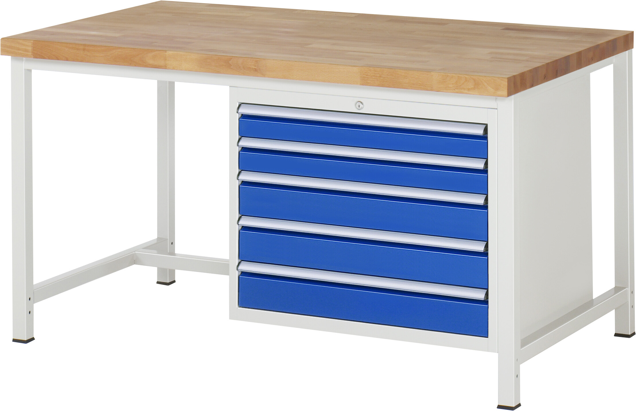 Werkbank Serie 8000 - Modell 8271 B1500 x T900 x H840-1040 mm Buche-Massiv-Arbeitsplatte 40 mm. Gestell Vierkantrohr. Werkbank mit einstellbarer Arbeitshöhe. 5 x Schublade (2xH90, 3xH120 mm). Pulverbeschichtung Flächenlast max. 1.250 kg Lieferung komplett montiert Qualitätsgarantie 5 Jahre Made in Germany