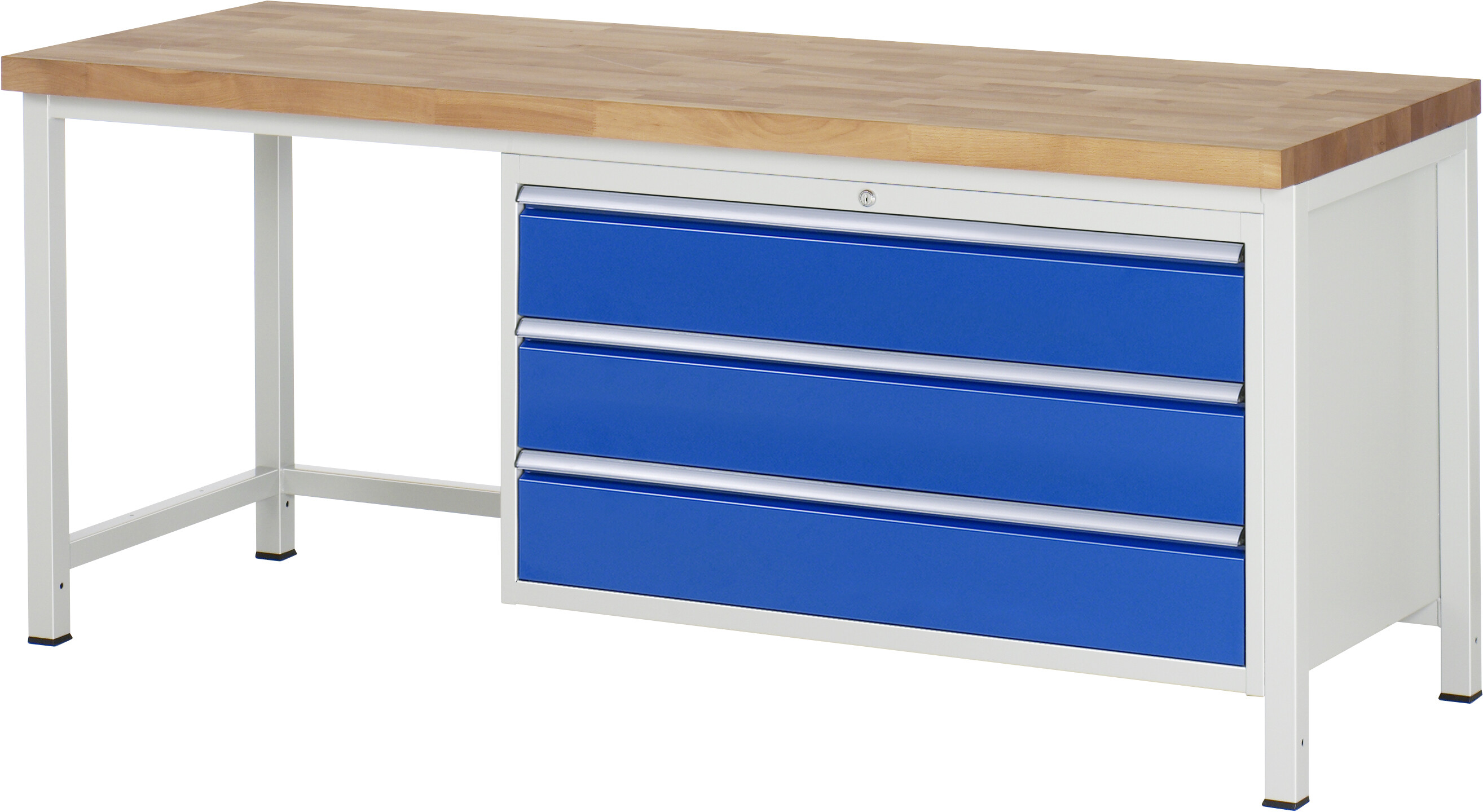 Werkbank Serie 8000 - Modell 8357 B2000 x T700 x H840-1040 mm Buche-Massiv-Arbeitsplatte 40 mm. Gestell Vierkantrohr. Werkbank mit einstellbarer Arbeitshöhe. 3 x Schublade (3xH180 mm). Pulverbeschichtung Flächenlast max. 1.250 kg Lieferung komplett montiert Qualitätsgarantie 5 Jahre Made in Germany
