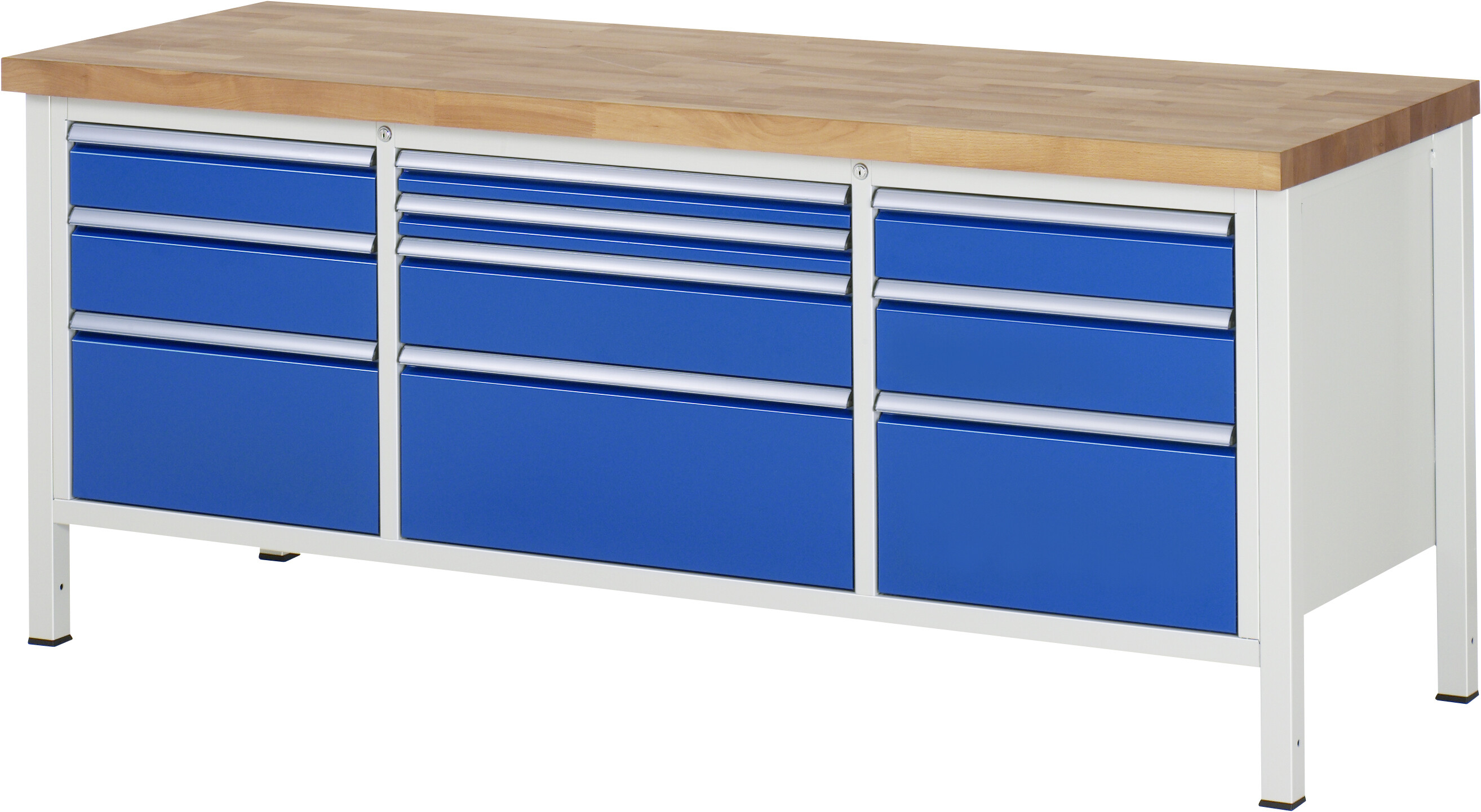 Werkbank Serie 8000 - Modell 8756 B2000 x T700 x H840-1040 mm Buche-Massiv-Arbeitsplatte 40 mm. Gestell Vierkantrohr. Werkbank mit einstellbarer Arbeitshöhe. 10 x Schublade (2xH60, 2xH120, 3xH150, 3xH270 mm). Pulverbeschichtung Flächenlast max. 1.250 kg Lieferung komplett montiert Qualitätsgarantie 5 Jahre Made in Germany