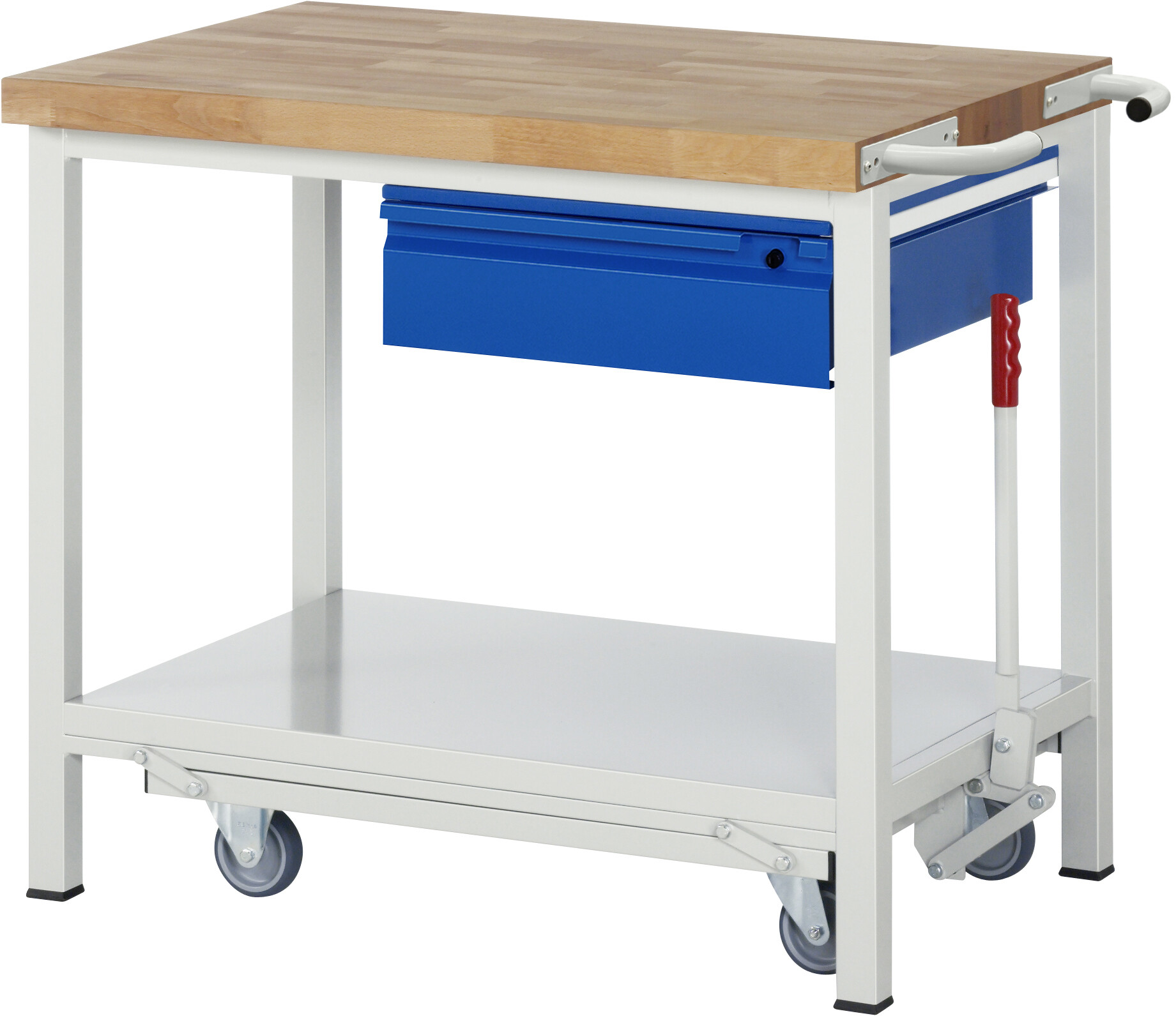 Absenkbare Werkbank - Modell 8001 BASIC B1000 x T700 x H880 mm Buche-Massiv-Arbeitsplatte 40 mm. Gestell Vierkantrohr mit absenkbarem Fahrgestell. 1 x Schublade auf rollengelagerten Auszugsschienen (1xH150 mm). Pulverbeschichtung Flächenlast max. 1.250 kg (bzw. max. 450 kg bei ausgefahrenem Fahrgestell) Lieferung komplett montiert Qualitätsgarantie 5 Jahre Made in Germany
