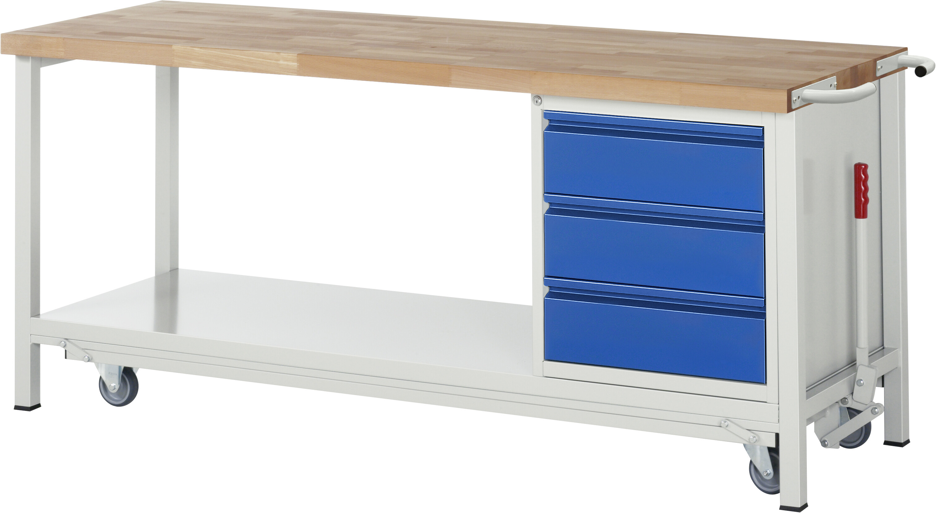 Absenkbare Werkbank - Modell 8157 BASIC B2000 x T700 x H880 mm Buche-Massiv-Arbeitsplatte 40 mm. Gestell Vierkantrohr mit absenkbarem Fahrgestell. 3 x Schublade auf rollengelagerten Auszugsschienen (3xH180 mm). Pulverbeschichtung Flächenlast max. 1.250 kg (bzw. max. 450 kg bei ausgefahrenem Fahrgestell) Lieferung komplett montiert Qualitätsgarantie 5 Jahre Made in Germany