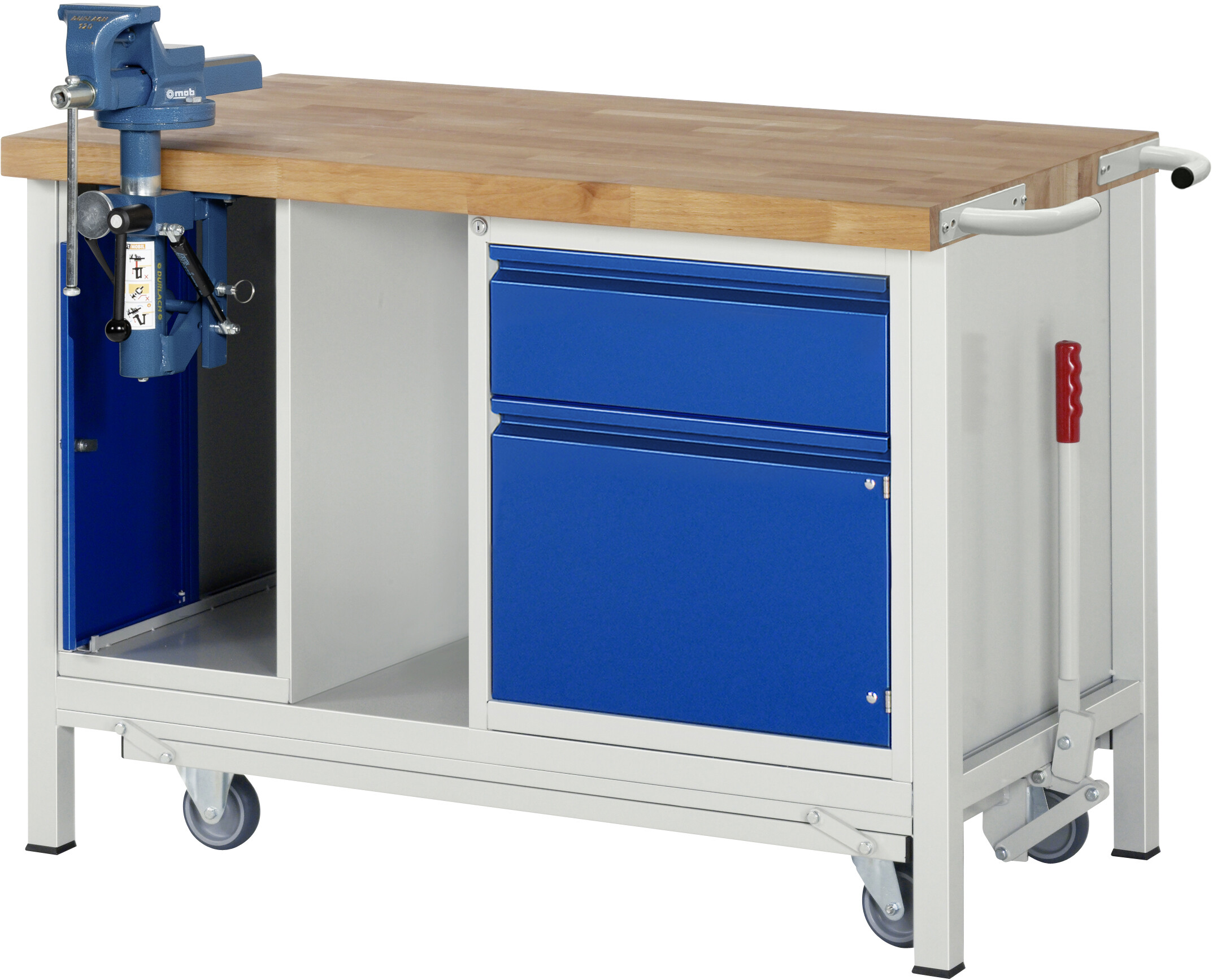 Absenkbare Werkbank - Modell 8181 BASIC B1250 x T700 x H880 mm Buche-Massiv-Arbeitsplatte 40 mm. Gestell Vierkantrohr mit absenkbarem Fahrgestell. 1 x Schraubstock. 1 x Schublade auf rollengelagerten Auszugsschienen (1xH180 mm). 1 x Flügeltür (H360 mm). Pulverbeschichtung Flächenlast max. 1.250 kg (bzw. max. 450 kg bei ausgefahrenem Fahrgestell) Lieferung komplett montiert Qualitätsgarantie 5 Jahre Made in Germany