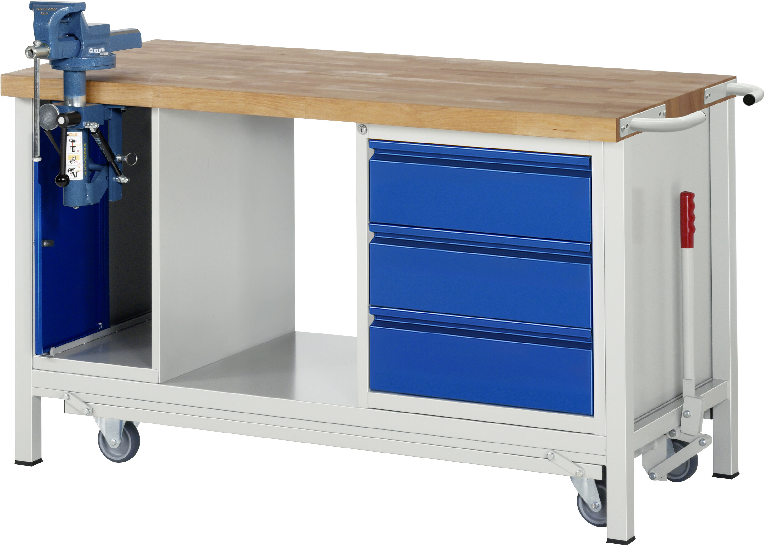 Absenkbare Werkbank - Modell 8183 BASIC B1500 x T700 x H880 mm Buche-Massiv-Arbeitsplatte 40 mm. Gestell Vierkantrohr mit absenkbarem Fahrgestell. 1 x Schraubstock. 3 x Schublade auf rollengelagerten Auszugsschienen (3xH180 mm). Pulverbeschichtung Flächenlast max. 1.250 kg (bzw. max. 450 kg bei ausgefahrenem Fahrgestell) Lieferung komplett montiert Qualitätsgarantie 5 Jahre Made in Germany