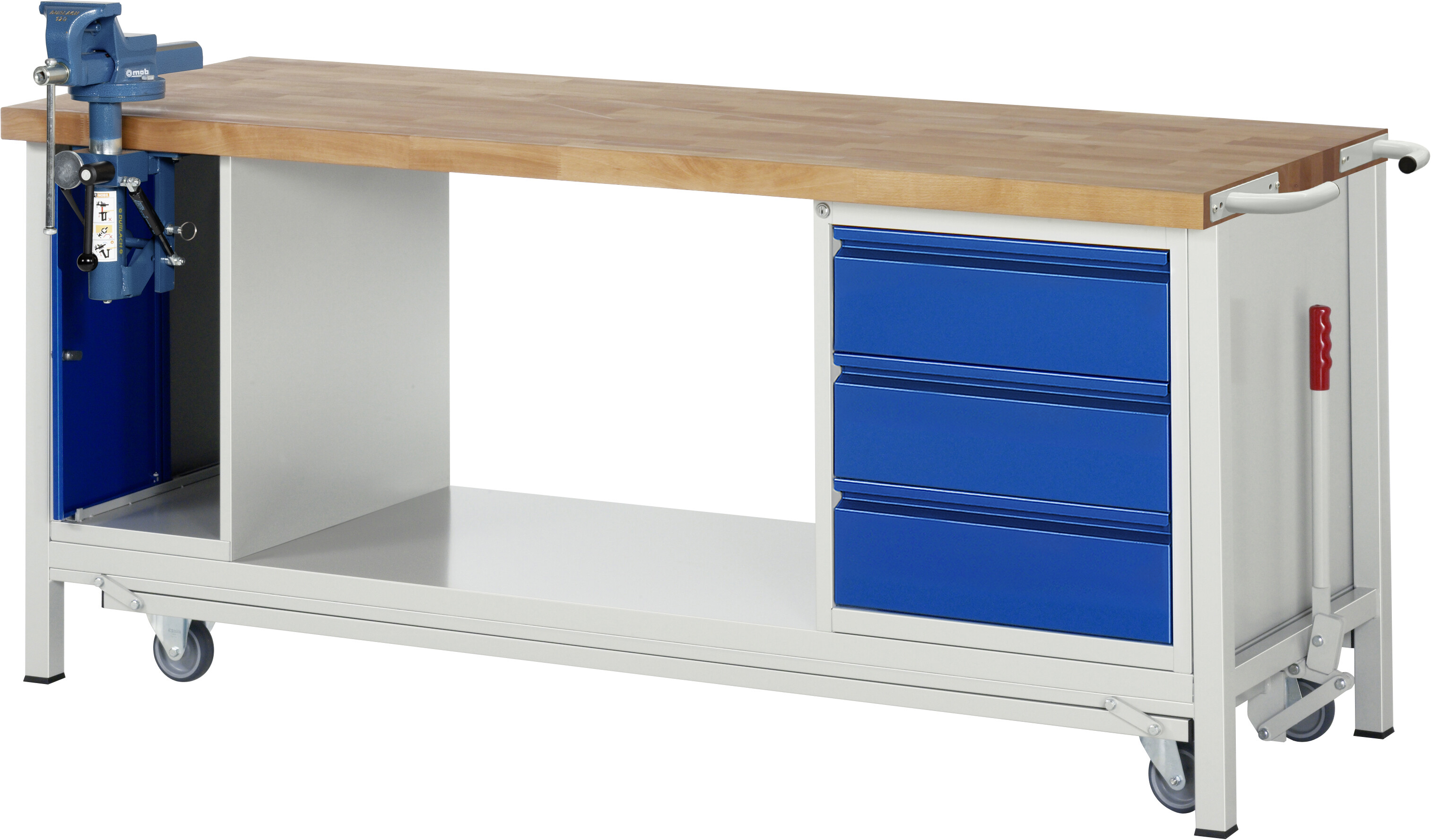 Absenkbare Werkbank - Modell 8183 BASIC B2000 x T700 x H880 mm Buche-Massiv-Arbeitsplatte 40 mm. Gestell Vierkantrohr mit absenkbarem Fahrgestell. 1 x Schraubstock. 3 x Schublade auf rollengelagerten Auszugsschienen (3xH180 mm). Pulverbeschichtung Flächenlast max. 1.250 kg (bzw. max. 450 kg bei ausgefahrenem Fahrgestell) Lieferung komplett montiert Qualitätsgarantie 5 Jahre Made in Germany