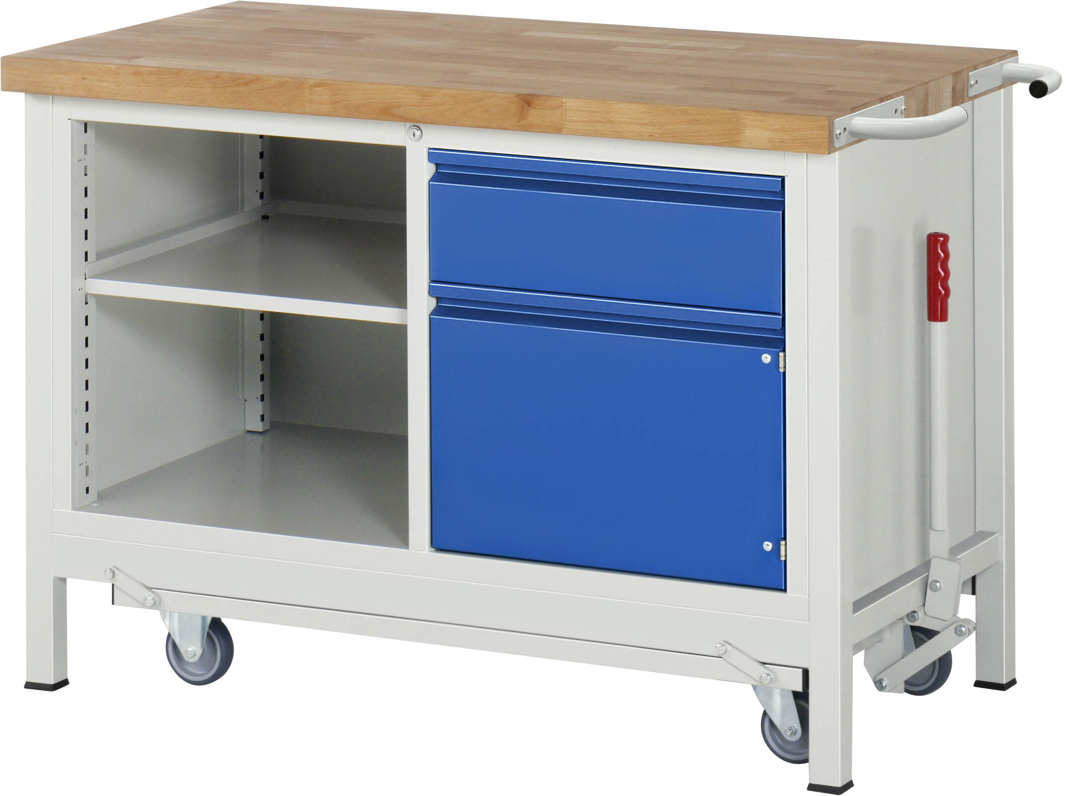 Absenkbare Werkbank - Modell 8461 BASIC B1250 x T700 x H880 mm Buche-Massiv-Arbeitsplatte 40 mm. Gestell Vierkantrohr mit absenkbarem Fahrgestell. 1 x Schublade auf rollengelagerten Auszugsschienen (1xH180 mm). 1 x Flügeltür (H540 mm). Offenes Fach mit höhenverstellbarem Fachboden. Pulverbeschichtung Flächenlast max. 1.250 kg (bzw. max. 450 kg bei ausgefahrenem Fahrgestell) Lieferung komplett montiert Qualitätsgarantie 5 Jahre Made in Germany