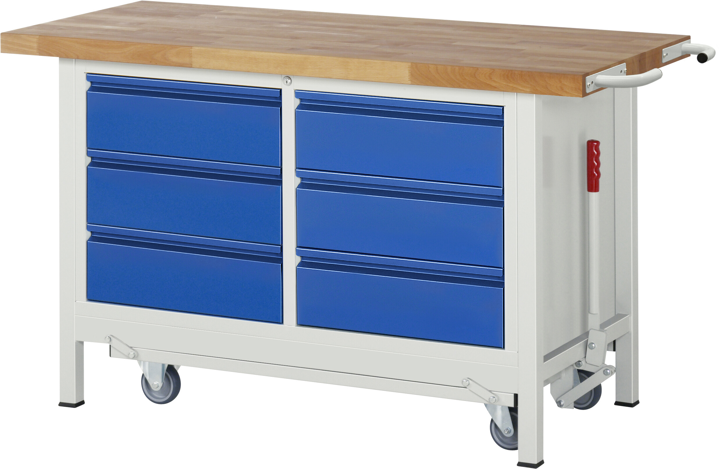 Absenkbare Werkbank - Modell 8473 BASIC B1500 x T700 x H880 mm Buche-Massiv-Arbeitsplatte 40 mm. Gestell Vierkantrohr mit absenkbarem Fahrgestell. 6 x Schublade auf rollengelagerten Auszugsschienen (6xH180 mm). Pulverbeschichtung Flächenlast max. 1.250 kg (bzw. max. 450 kg bei ausgefahrenem Fahrgestell) Lieferung komplett montiert Qualitätsgarantie 5 Jahre Made in Germany
