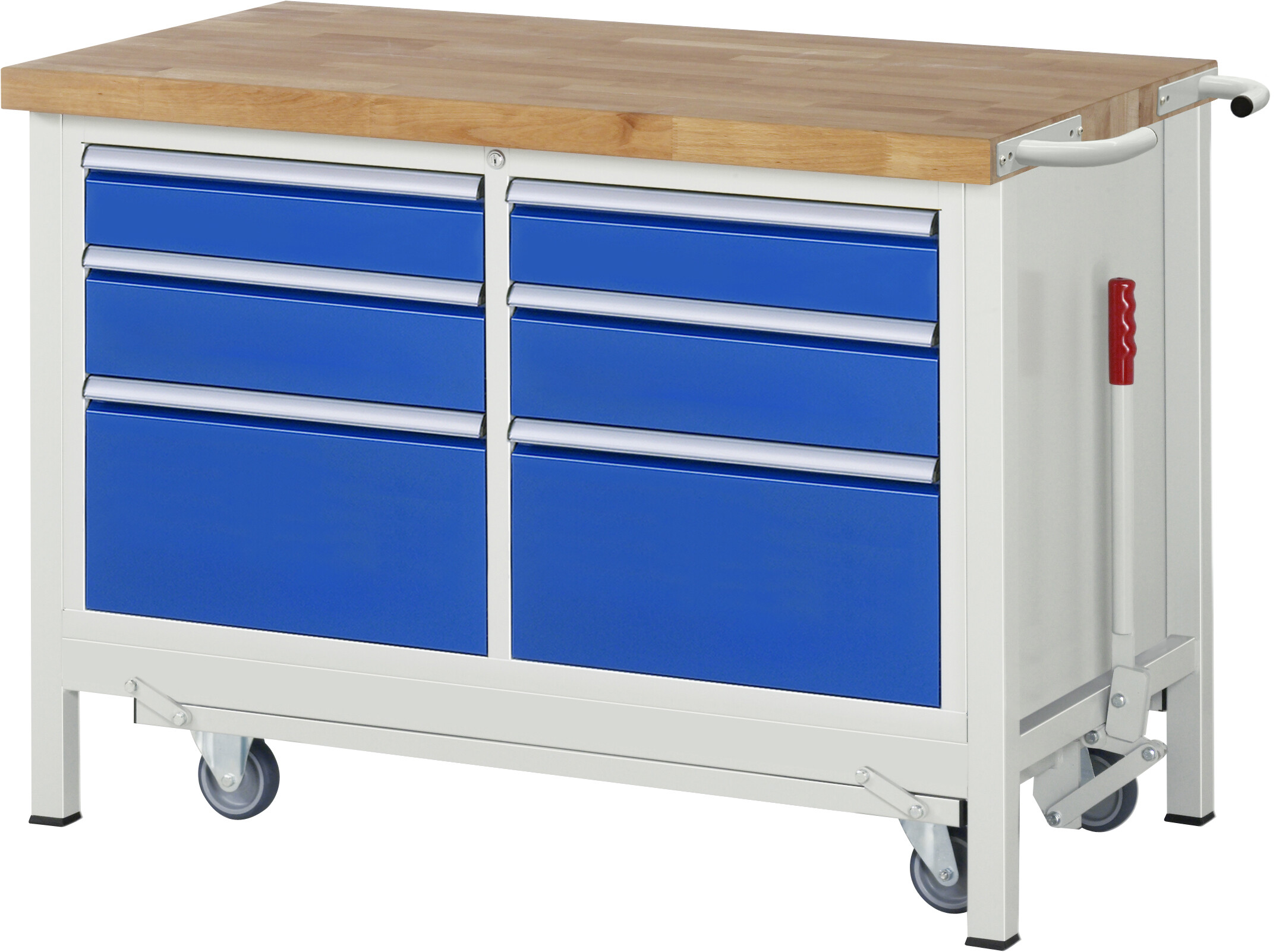 Absenkbare Werkbank 8000 - Modell 8475 B1250 x T700 x H880 mm Buche-Massiv-Arbeitsplatte 40 mm. Gestell Vierkantrohr mit absenkbarem Fahrgestell. 6 x Schublade (2xH120, 2xH150, 2xH270 mm). Pulverbeschichtung Flächenlast max. 1.250 kg (bzw. max. 450 kg bei ausgefahrenem Fahrgestell) Lieferung komplett montiert Qualitätsgarantie 5 Jahre Made in Germany
