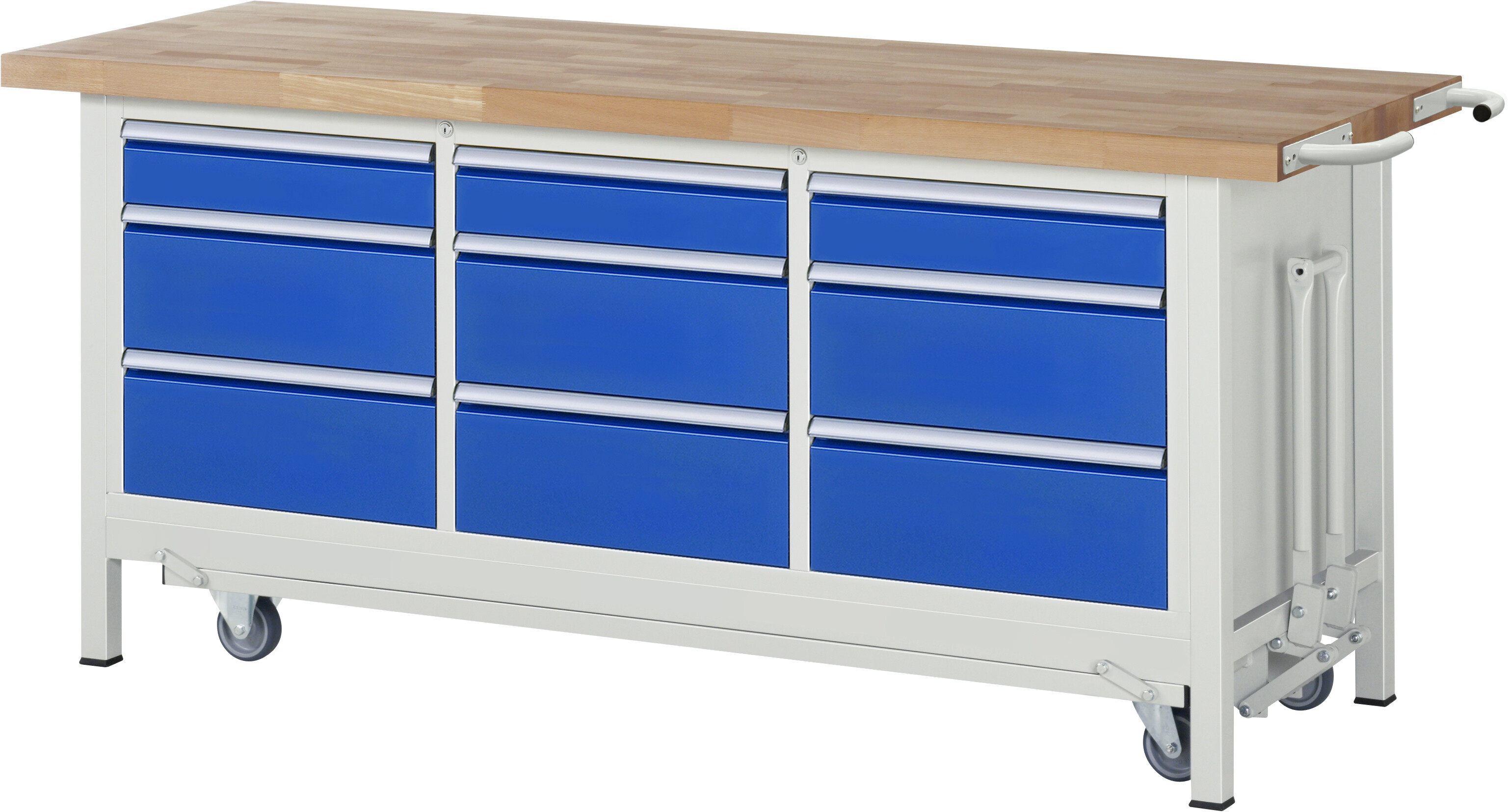 Absenkbare Werkbank 8000 - Modell 8573 B2000 x T700 x H880 mm Buche-Massiv-Arbeitsplatte 40 mm. Gestell Vierkantrohr mit absenkbarem Fahrgestell. 9 x Schublade (3xH120, 6xH120 mm). Pulverbeschichtung Flächenlast max. 1.250 kg (bzw. max. 450 kg bei ausgefahrenem Fahrgestell) Lieferung komplett montiert Qualitätsgarantie 5 Jahre Made in Germany