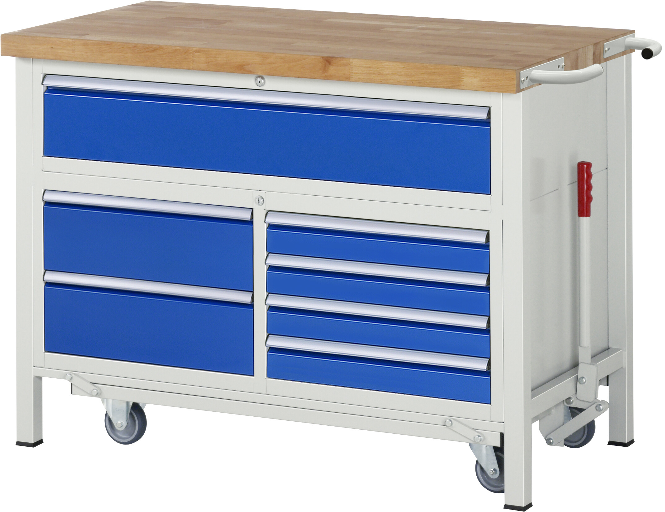 Absenkbare Werkbank 8000 - Modell 8921 B1250 x T700 x H920 mm Buche-Massiv-Arbeitsplatte 40 mm. Gestell Vierkantrohr mit absenkbarem Fahrgestell. 7 x Schublade (1xH180, 4xH90, 2xH180 mm). Pulverbeschichtung Flächenlast max. 1.250 kg (bzw. max. 450 kg bei ausgefahrenem Fahrgestell) Lieferung komplett montiert Qualitätsgarantie 5 Jahre Made in Germany