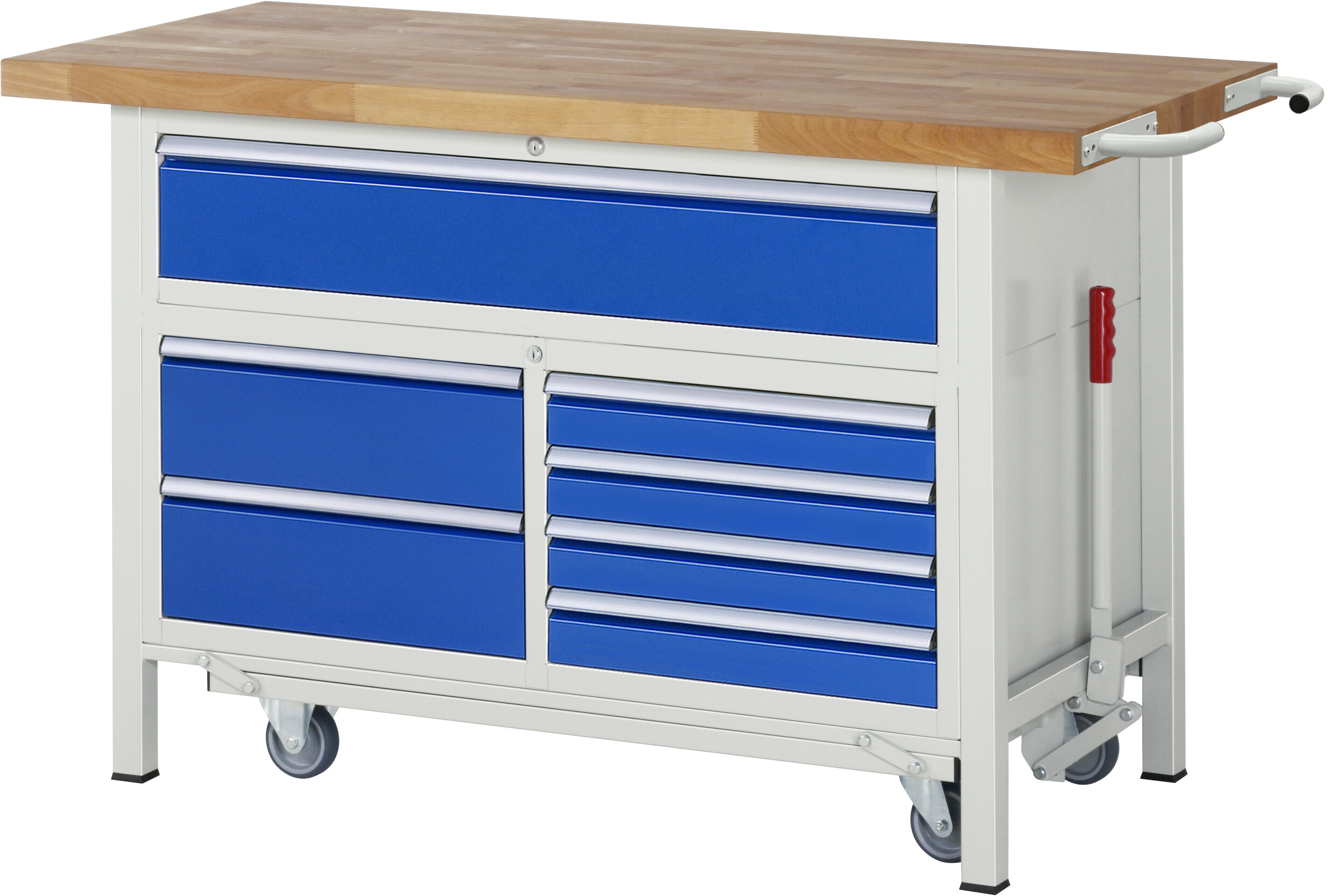 Absenkbare Werkbank 8000 - Modell 8921 B1500 x T700 x H920 mm Buche-Massiv-Arbeitsplatte 40 mm. Gestell Vierkantrohr mit absenkbarem Fahrgestell. 7 x Schublade (1xH180, 4xH90, 2xH180 mm). Pulverbeschichtung Flächenlast max. 1.250 kg (bzw. max. 450 kg bei ausgefahrenem Fahrgestell) Lieferung komplett montiert Qualitätsgarantie 5 Jahre Made in Germany