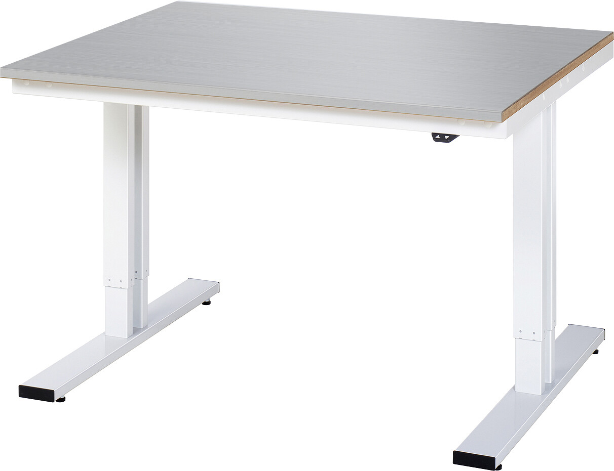 Werktisch Serie adlatus 300 B1250 x T1000 x H720-1120 mm Platte mit Edelstahlblechbelag 25 mm. Elektrische Verstellung mittels den 2 Doppelhubsäulen durch integrierten Linearantrieb. Pulverbeschichtung Flächenlast max. 300 kg Lieferung komplett montiert Qualitätsgarantie 5 Jahre Made in Germany