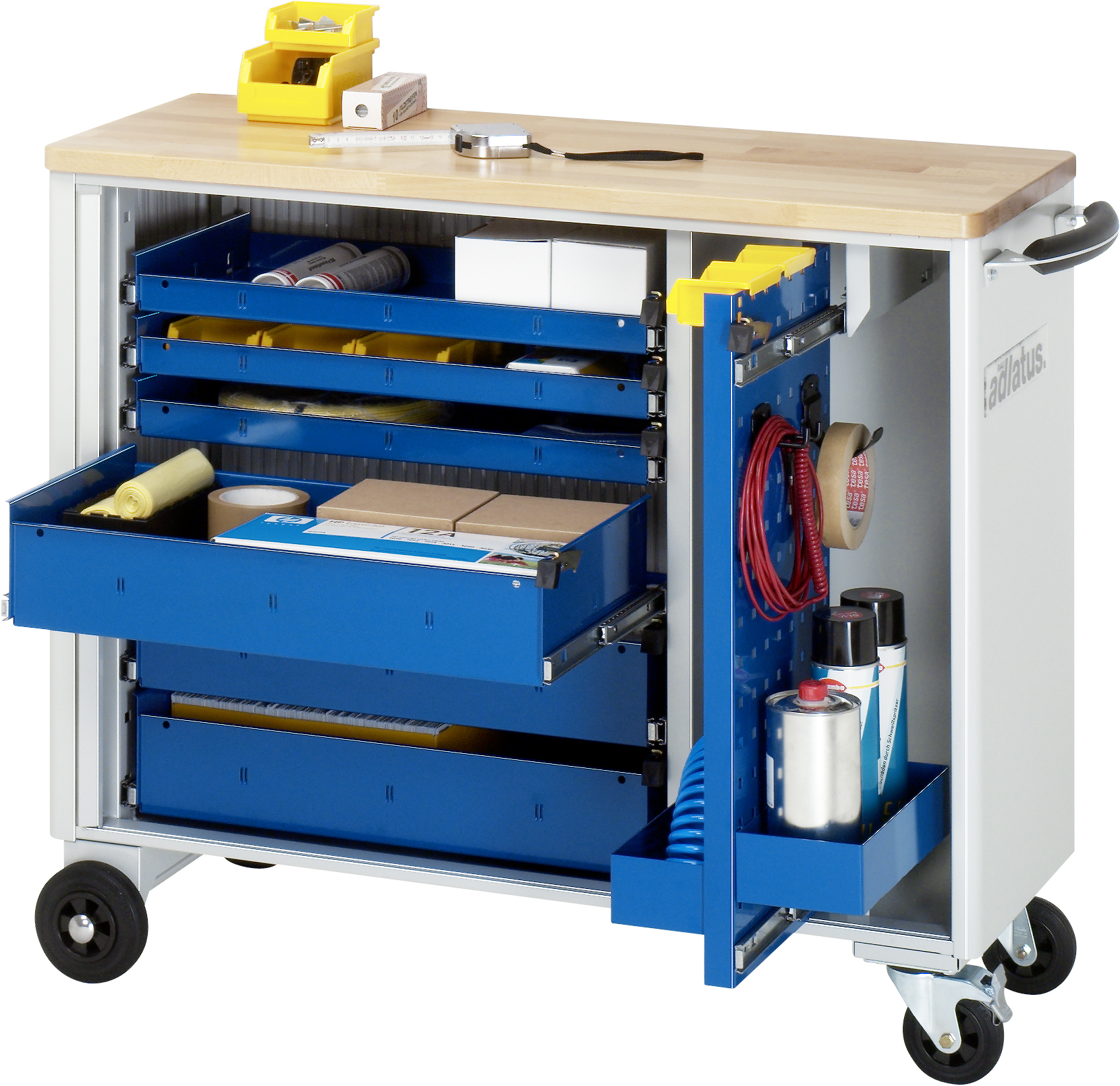 Werkzeugwagen Serie adlatus Modell 10060 B1025 x T400 x H860 mm Buche-Top 25 mm. 5 x Schublade (3xH40, 3x105 mm). 1 x Lochwandauszug. Breitspurfahrwerk. Pulverbeschichtung Gesamtbelastbarkeit max. 450 kg Lieferung komplett montiert Qualitätsgarantie 5 Jahre Made in Germany