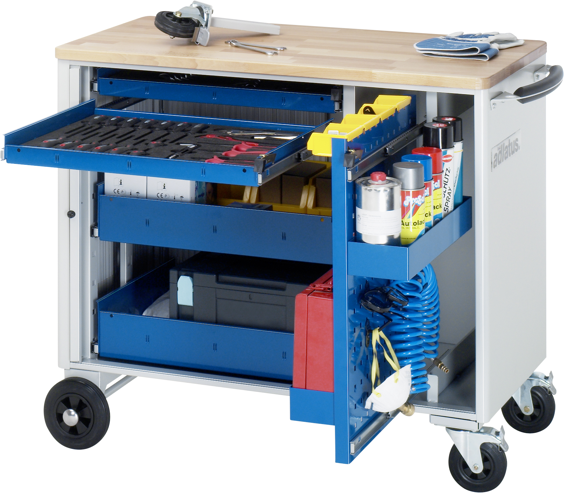 Werkzeugwagen Serie adlatus Modell 10240 B1025 x T520 x H890 mm Buche-Top 25 mm. 4 x Schublade (2xH40, 1x105, 1x130 mm). 1 x Lochwandauszug. Breitspurfahrwerk. Pulverbeschichtung Gesamtbelastbarkeit max. 450 kg Lieferung komplett montiert Qualitätsgarantie 5 Jahre Made in Germany