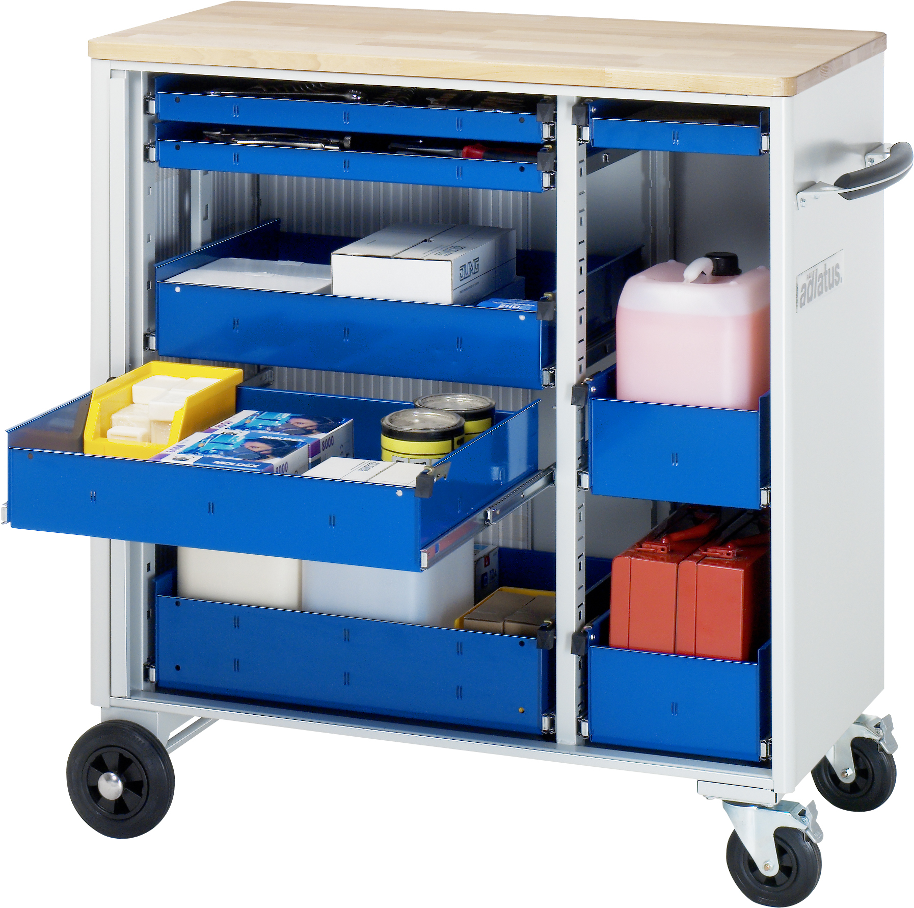 Werkzeugwagen Serie adlatus Modell 10810 B1025 x T520 x H1080 mm Buche-Top 25 mm. 8 x Schublade (3xH40, 2x105, 3x130 mm). 1 x Lochwandauszug. Breitspurfahrwerk. Pulverbeschichtung Gesamtbelastbarkeit max. 450 kg Lieferung komplett montiert Qualitätsgarantie 5 Jahre Made in Germany